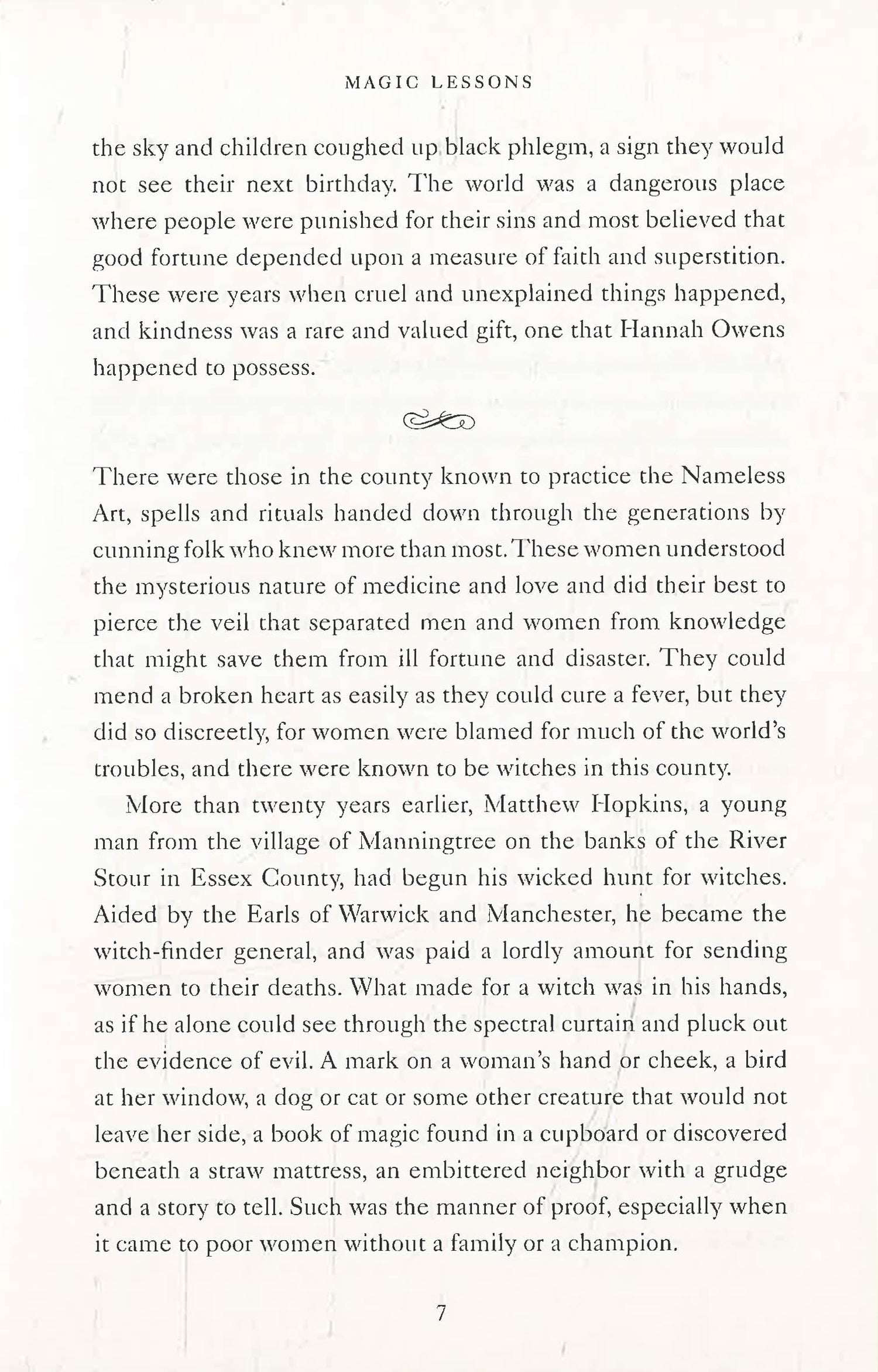 Where does the story of the Owens bloodline begin? With Maria Owens, in the 1600s, when she's abandoned in a snowy field in rural England as a baby. Under the care of Hannah Owens, Maria learns about the "Nameless Arts." Hannah recognizes that Maria has a gift and she teaches the girl all she knows. It is here that she learns her first important lesson: Always love someone who will love you back.
