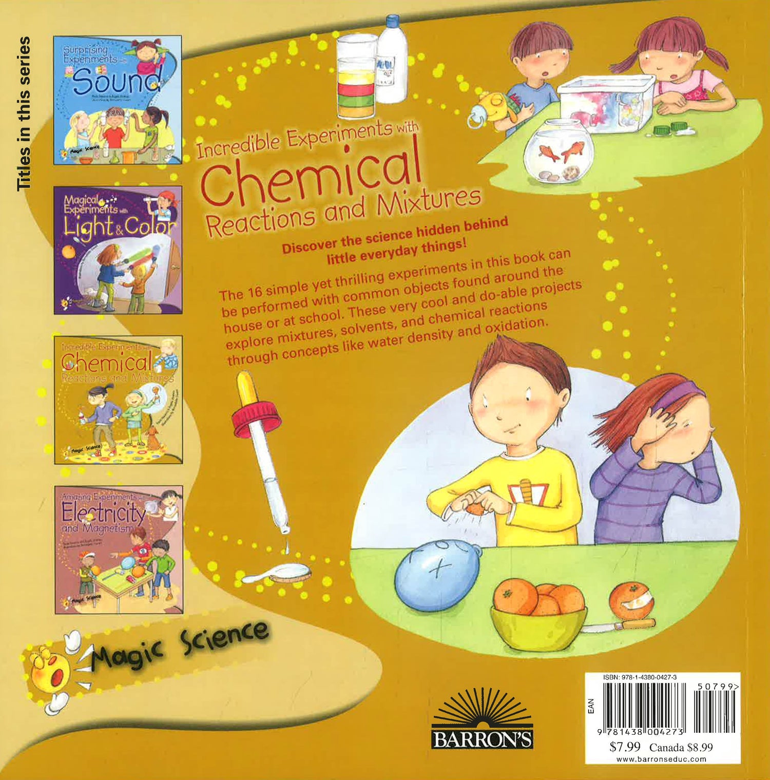 Fascinating scientific concepts are simplified and explored in ways that kids will enjoy in the Magic Science series. Each book presents 16 simple experiments that can be performed with common objects found around the house. Incredible Experiments with Chemical Reactions & Mixtures explores concepts like water density, oxidation, and more are explored using simple household materials. Each experiment includes illustrated, step-by-step instructions and a simple scientific explanation of what is happening during the experiment. Full-color illustrations on each page.