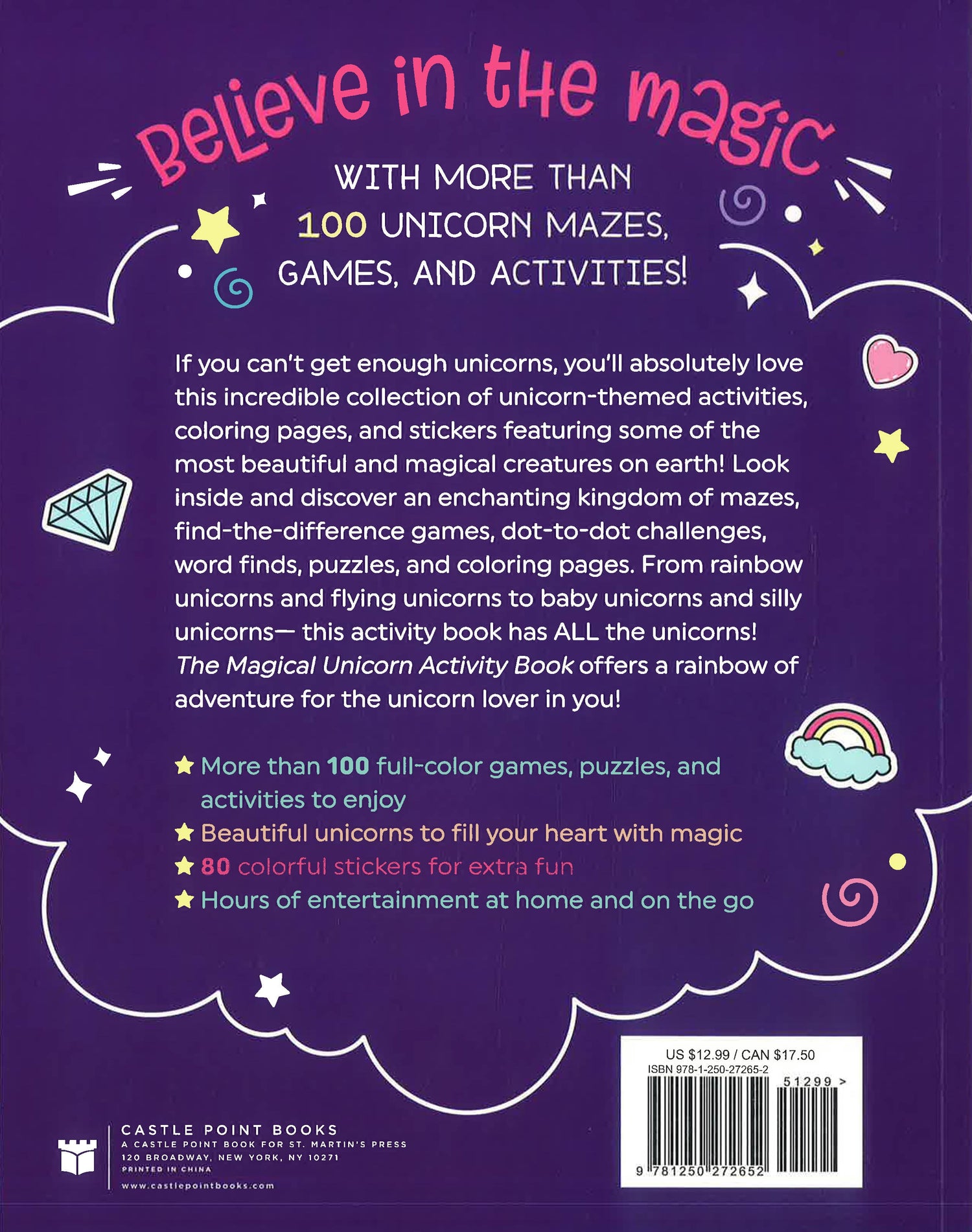 Look inside and discover an enchanting kingdom of mazes, find-the-difference games, dot-to-dot challenges, word finds, puzzles, and coloring pages. From rainbow unicorns and flying unicorns to baby unicorns and silly unicorns--this activity book has ALL the unicorns!
