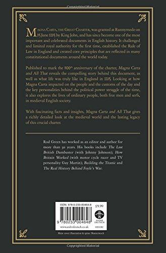Magna Carta, the Great Charter, was granted at Runnymede on 15th June 1215 by King John, and has since become one of the most important and celebrated documents in English history. It challenged and limited royal authority for the first time, established the Rule of Law in England and created core principles that are reflected in many constitutional documents around the world today. Published to mark the 800th anniversary of the charter, Magna Carta and All That reveals the compelling story behind this document, as well as what life was truly like in England in 1215. Looking at how Magna Carta impacted on the people and the customs of the day and the key personalities behind the political power struggle of the time, it also explores the lives of ordinary people, both free men and serfs, in medieval English society. With fascinating facts and insights, Magna Carta and All That, gives a richly detailed look at the medieval world and the lasting legacy of this crucial document.