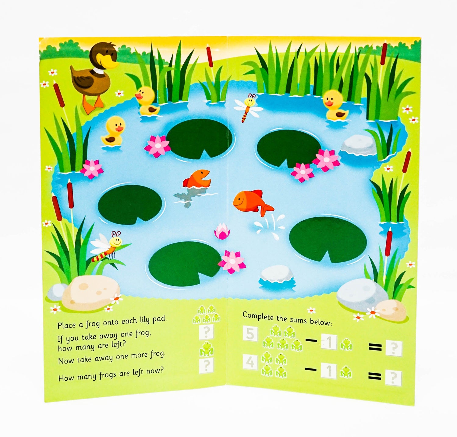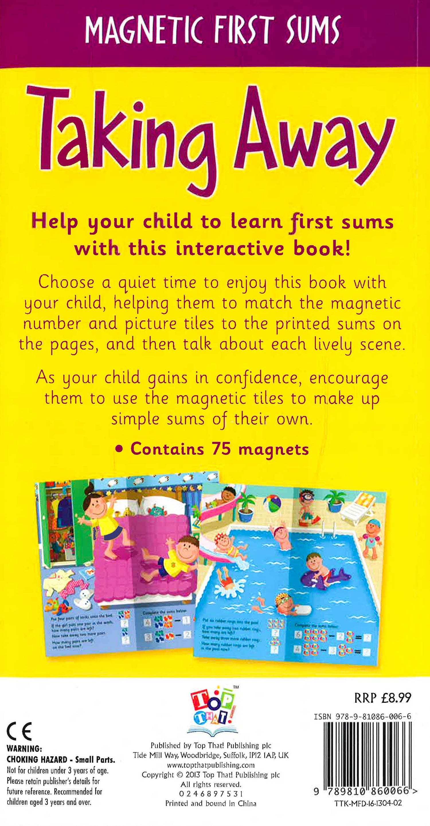 Help your child to learn first sums with this interactive book! Choose a quiet time to enjoy this book with your child, helping them to match the magnetic number and picture tiles to the printed sums on the pages, and then talk about each lively scene.