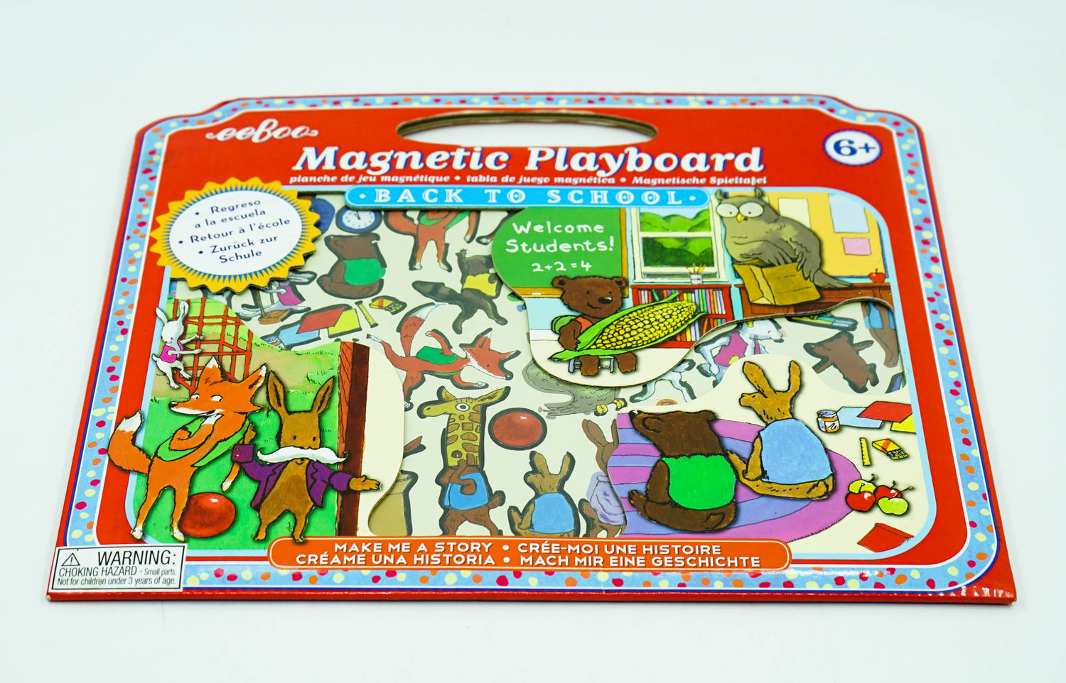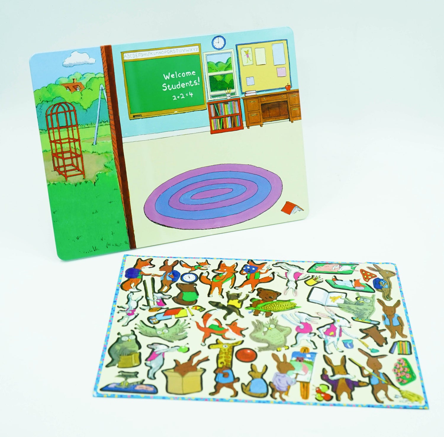 Is Mr. Owl flapping his wings in excitement about learning? Or are his animal students just giving him a headache? Tell the story your way with the classroom scene on this magnetic playboard, with characters illustrated by Kevin Hawkes, including a white rabbit and a brown rabbit, a fox, a bear cub, and a raccoon. And since these magnetic figures are presented in different poses, you can fill up the schoolroom and recess yard with as many of them as you'd like. Here too are books, pencils, play equipment, treats, and other schoolroom accessories. Youngsters 5 and up can place the 38 magnetic items into the scene wherever they wish, and the colorful 9 ? 12?inch playboard includes a folding easel back for standing it up. The set is presented in a windowed portfolio with a carry handle.