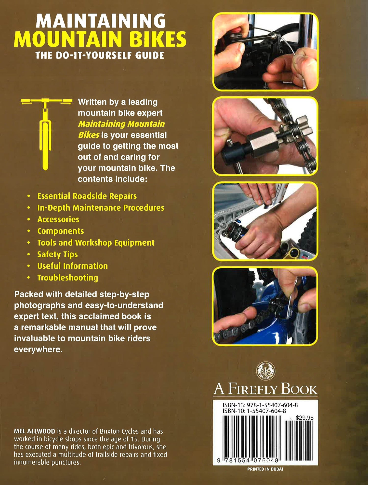 A comprehensive illustrated guide now updated with information on all of the latest bikes and equipment.Maintaining Mountain Bikes is the essential guide to getting the most out of riding and caring for any model and vintage of mountain bike, including the most recent versions and their components.Using detailed step-by-step photographs and clear text, two leading mountain bike experts show riders how to keep their equipment in tiptop shape. This updating of Mountain Bike Maintenance includes 100 new full-color photographs and fully revised text that covers the bicycle in detail from wheel to wheel, including:Bike parts terminologyBasic repair toolsRegular routines for maintenance and cleaningSafety routinesShimano chainsMending a broken chain, shortening a chain to single speed, deep cleaning a chainTwisted linksCrank and pedal repairsCantilever brakes and disc brakesFitting and adjusting brake blocks, a new brake cable and new brake unitsFitting a new gear cableTransmission troubleshootingTiresSuspensionCreaking noisesEvery mountain bike component is thoroughly described, including its location, function, maintenance, common problems and repairs, as well as its replacement and installation. The authors also recommend the essential tools to carry on board and how to do roadside repairs. There is expert advice on annual and seasonal tunings, safety checks, and the nuts and bolts of adjusting, fitting, upgrading and replacing every part of a mountain bike. The updated resource list of suppliers is particularly valuable.