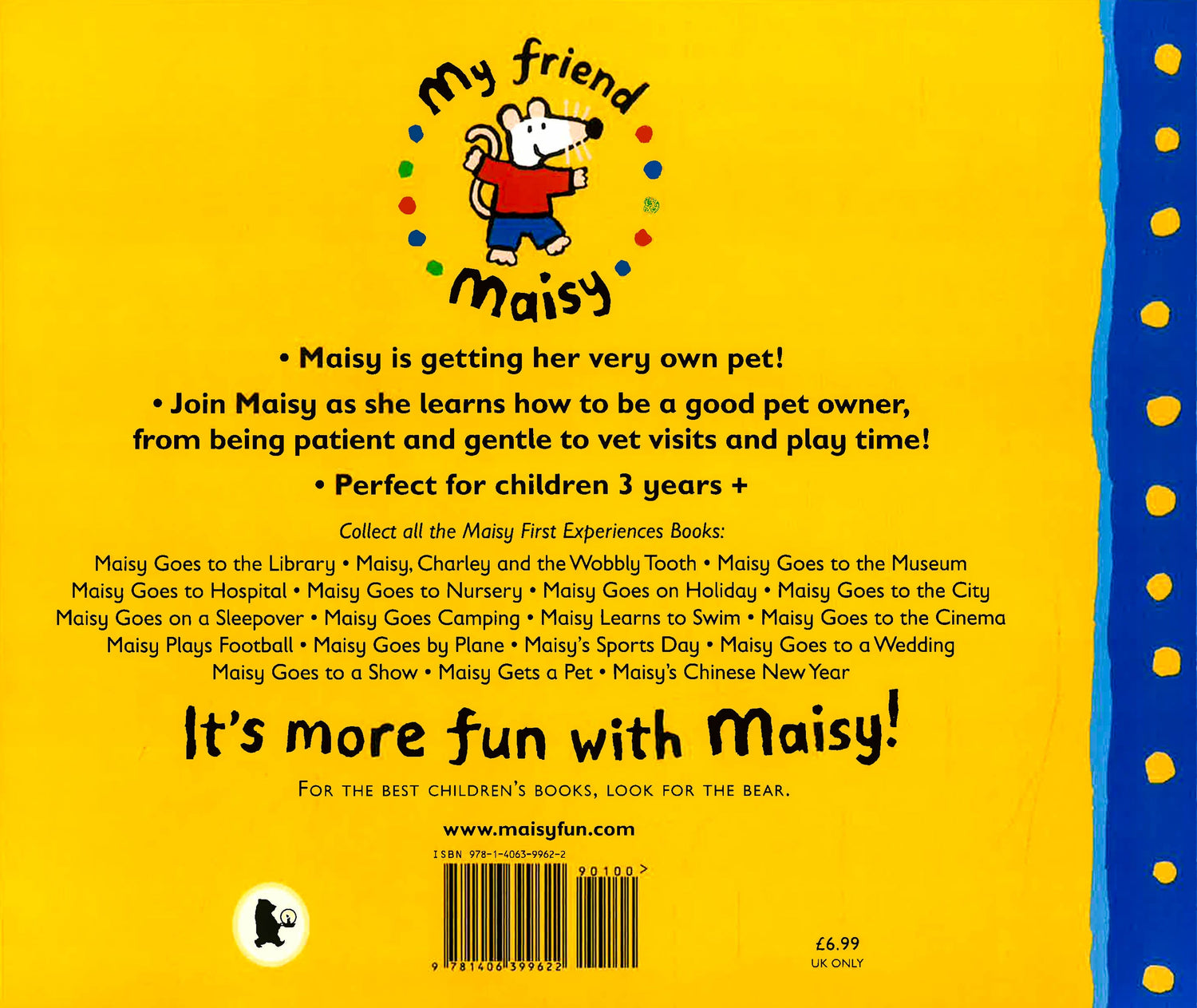 Maisy is getting a pet! Join her as she chooses the perfect kitten and takes it home to look after. This bright and humorous story is ideal for teaching little ones about responsible pet ownership.