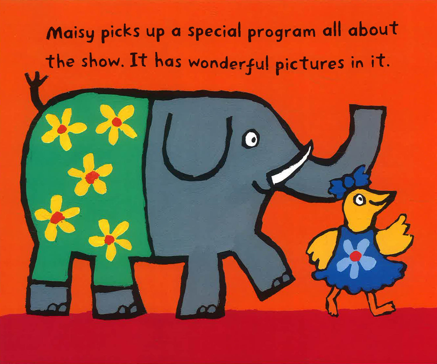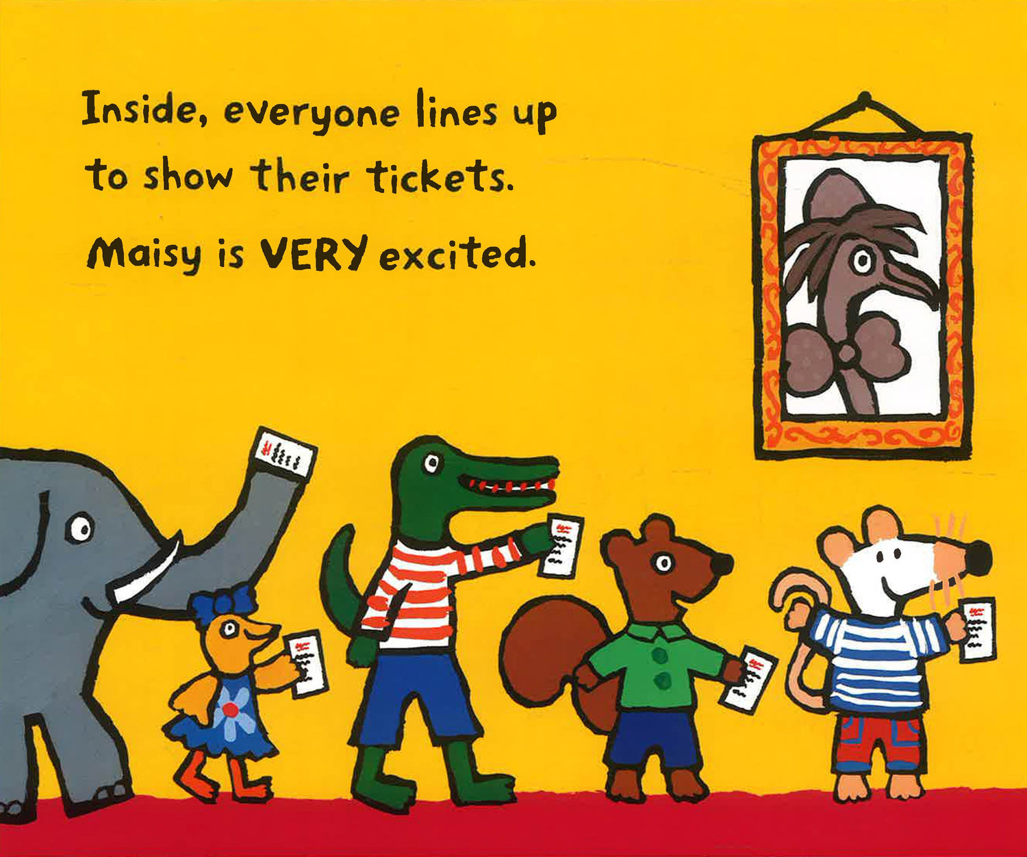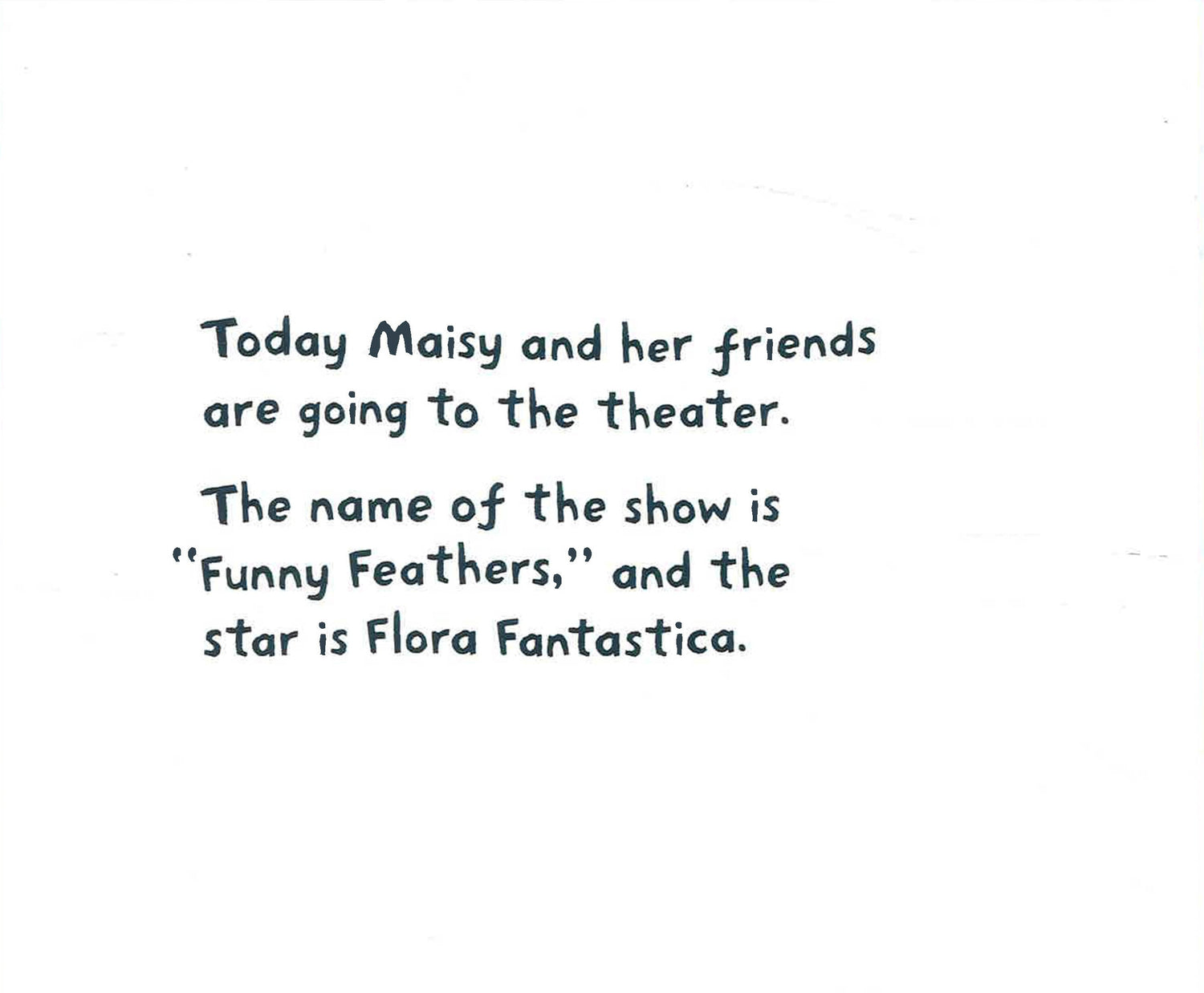 Today, Maisy and her friends are off to the theater to see a show starring Flora Fantastica! First they line up to show their tickets. After the usher helps them all find their seats, the lights go down, and Maisy and her friends take in a feast for the senses: dramatic flashing lights, colorful costumes, amazing songs, and lots of exciting characters. From the rise of the curtain through intermission (and snacks) to a standing ovation at the end, Maisy takes her fans on a trip to the theater that makes a new experience familiar and fun.