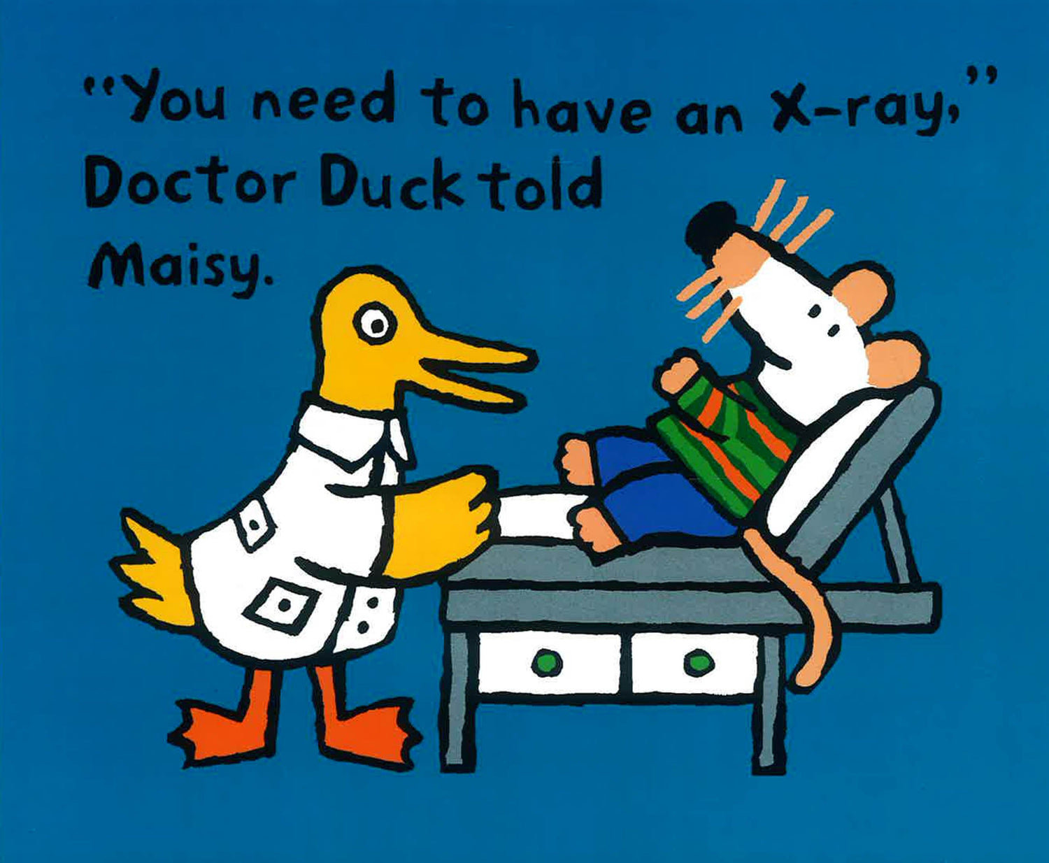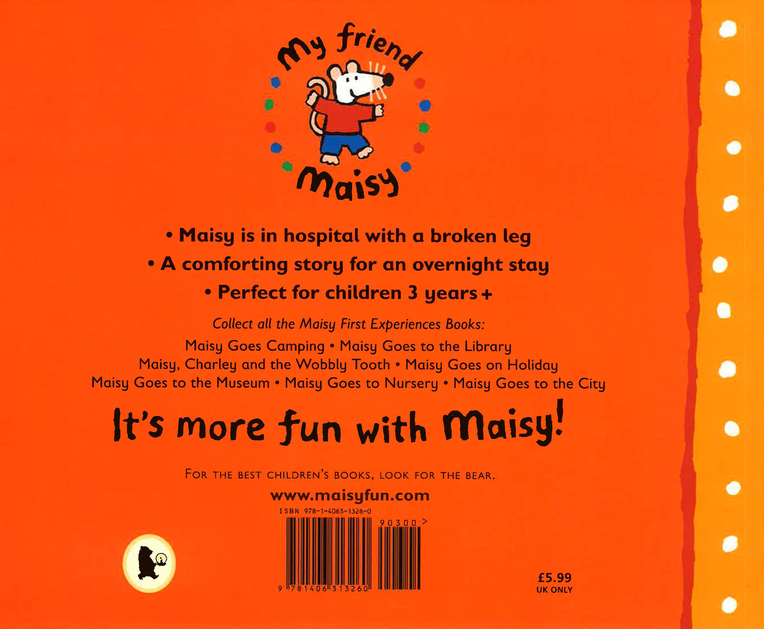 Join Maisy, every toddler's best friend, for her first experience of going to hospital.Maisy has broken her leg playing on the trampoline, and now she's in hospital for the night. At first it's a bit scary being all on her own, but she soon makes friends with Dotty in the next bed, and when Cyril and Tallulah visit the next day, Maisy begins to feel much better!