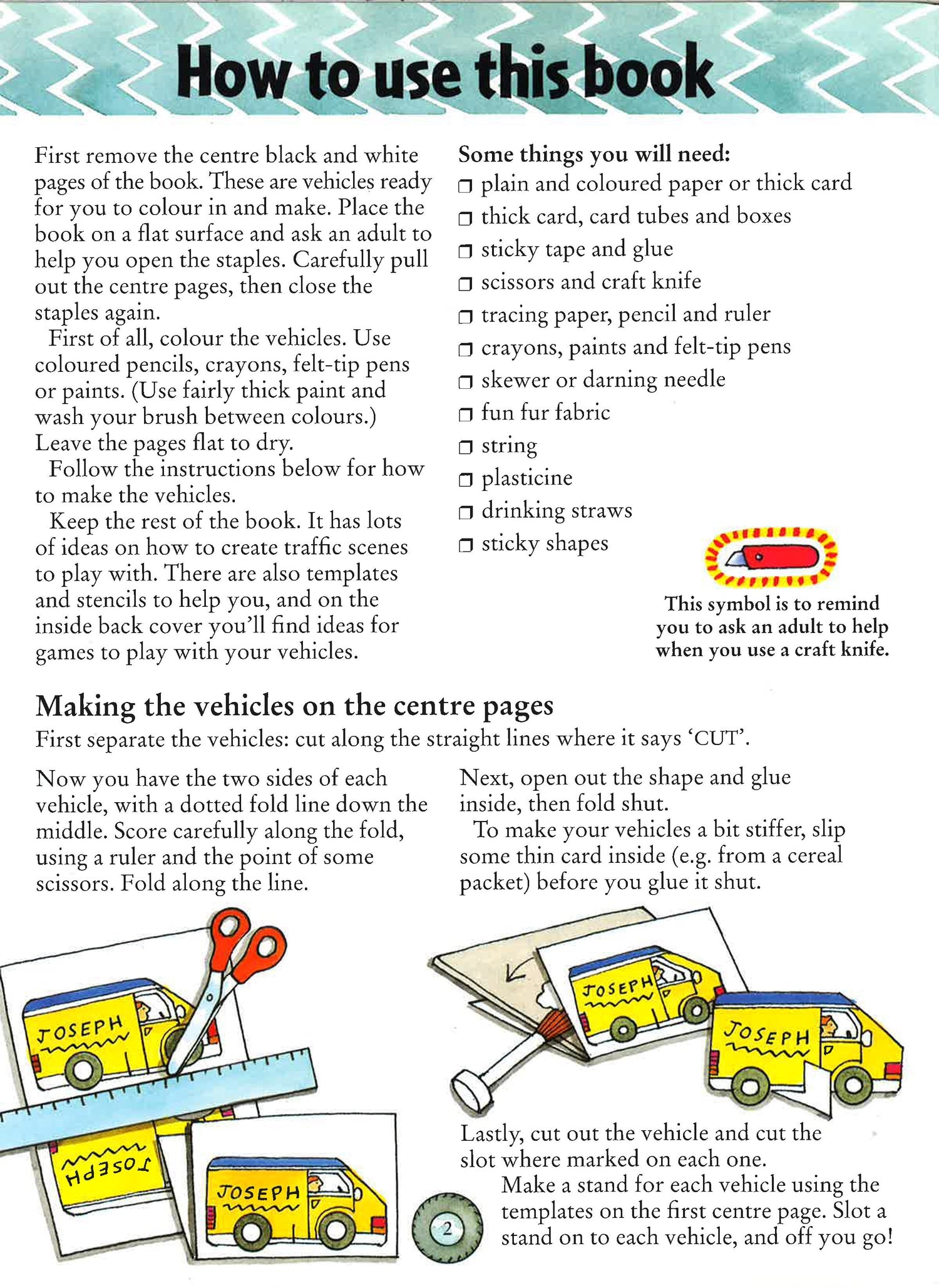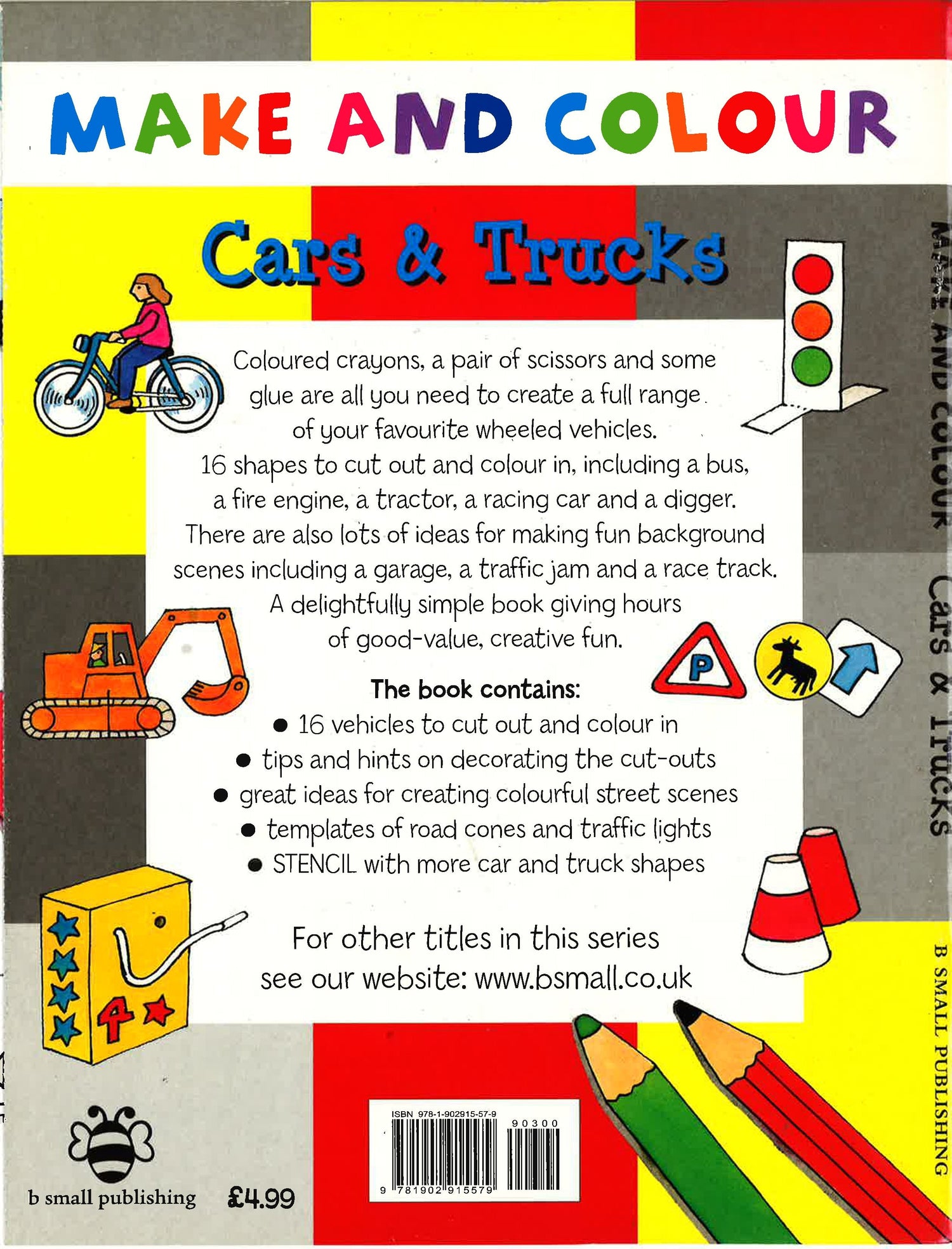 Colour in and cut out a great selection of cars and trucks. Slot them together, stand them up and play garages, race tracks and busy streets. Includes stencils of car and truck shapes. Coloured crayons and scissors are all you need to create your very own favourite wheeled vehicles. Contents include:- * 16 vehicles to cut out and colour in * Tips and hints on decorating the cut-outs * Great ideas for creating colourful street scenes * Templates of road cones and traffic lights * Stencil shapes include cars, a tractor and a digger.