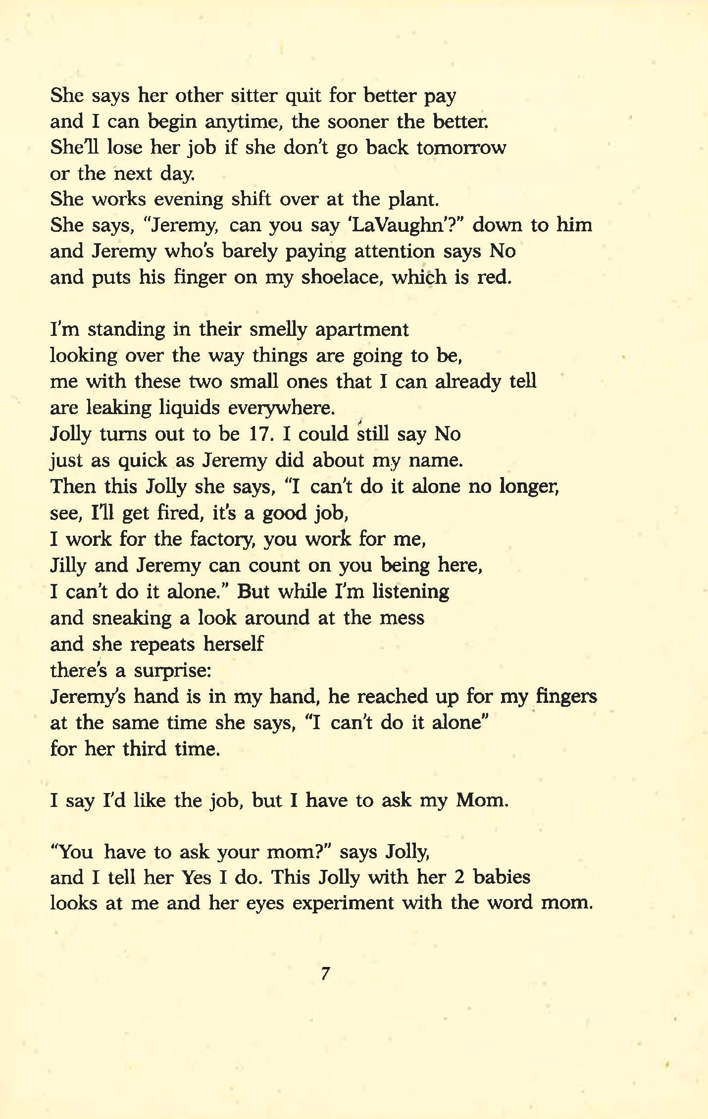 In order to earn money for college, fourteen-year-old La Vaughn babysits for a teenage mother.