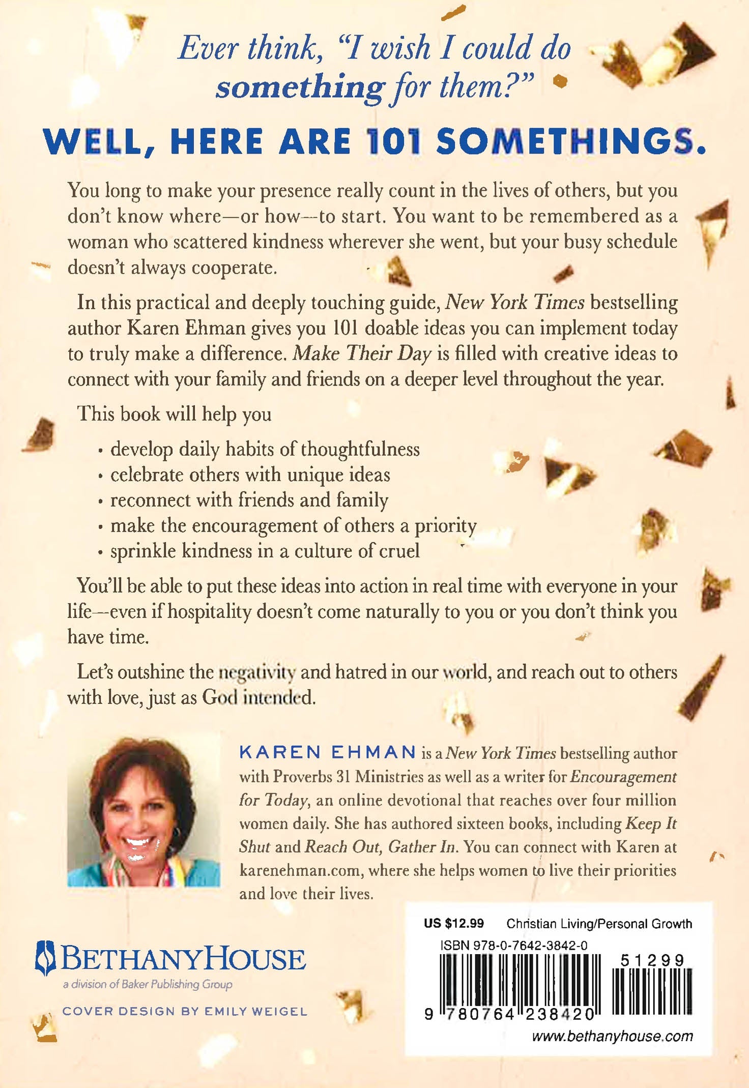 You dream of making your presence really count in the lives of others, but you don't know where--or how--to start. You want to be remembered as a woman who scattered kindness to everyone she knew, but you feel like your busy schedule constantly gets in the way. In this practical and deeply touching guide--inspired by her book Reach Out, Gather In--popular author Karen Ehman gives you 101 actionable ideas you can implement today to truly make a difference in the lives of other people. Make Their Day is filled with creative ideas to connect with your family and friends on a deeper level throughout the year. This book will help you develop habits of kindness, reconnect with friends and family, and make encouraging people a priority. You'll be able to put these ideas into action in real time with everyone in your life--even if hospitality doesn't come naturally to you or you don't think you have time. Let's outshine the negativity and hatred in our world, and reach out to others with love, just as God intended.