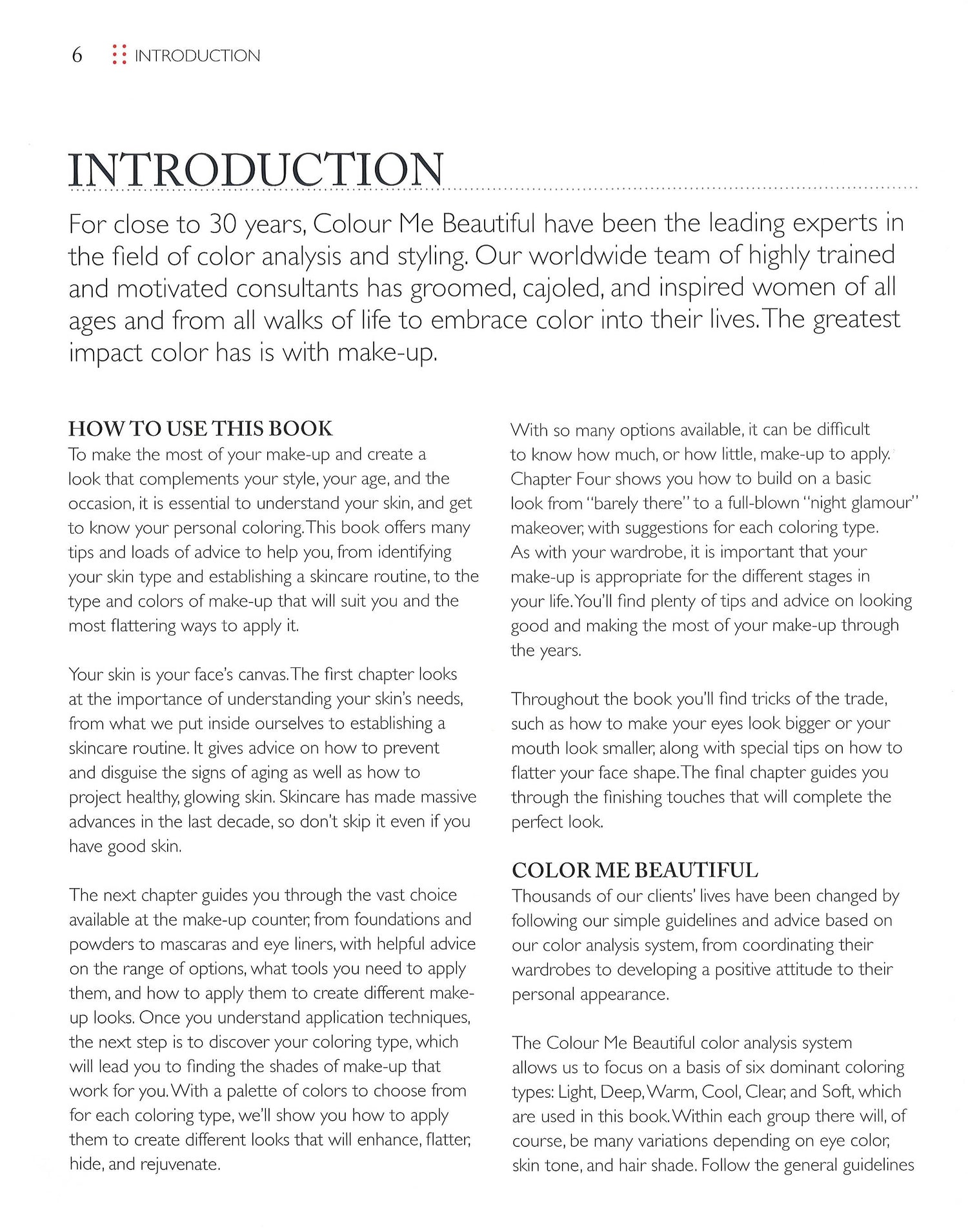 Discover your perfect colors, learn how to apply every type of makeup and how to add the final touches, with useful tips on hair and accessories. Find fantastic new looks by identifying which of your favorite celebrities have your colors and how to emulate their look. With 6 color types covering 4 age ranges, and detailing 4 looks for each color and face shape, get yourself gorgeous with the Color Me Beautiful Make Up Manual, whatever your age, whatever the occasion.
