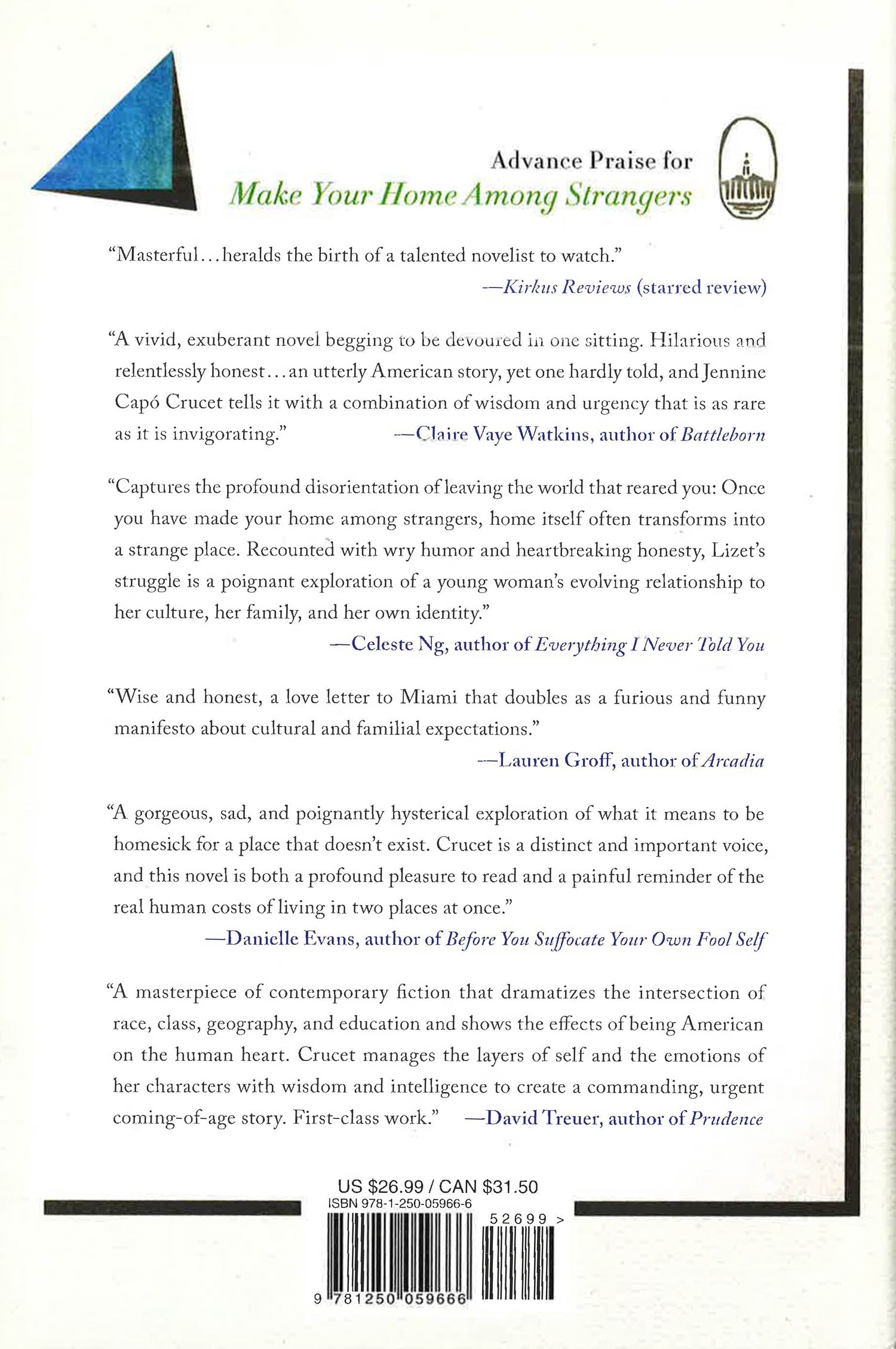 A New York Times Book Review Editor's Choice, winner of the International Latino Book Award for Best Latino-themed Fiction 2016, Longlisted for the 2015 Center for Fiction First Novel Prize. Named a best book of the season by Cosmopolitan, Vanity Fair, Harper's Bazaar, Redbook, Bustle, NBC Latino and Men's Journal The arresting debut novel from award-winning writer Jennine Cap? Crucet When Lizet-the daughter of Cuban immigrants and the first in her family to graduate from high school-secretly applies and is accepted to an ultra-elite college, her parents are furious at her decision to leave Miami. Just weeks before she's set to start school, her parents divorce and her father sells her childhood home, leaving Lizet, her mother, and Leidy-Lizet's older sister, a brand-new single mom-without a steady income and scrambling for a place to live. Amidst this turmoil, Lizet begins her first semester at Rawlings College, distracted by both the exciting and difficult moments of freshman year. But the privileged world of the campus feels utterly foreign, as does her new awareness of herself as a minority. Struggling both socially and academically, she returns to Miami for a surprise Thanksgiving visit, only to be overshadowed by the arrival of Ariel Hernandez, a young boy whose mother died fleeing with him from Cuba on a raft. The ensuing immigration battle puts Miami in a glaring spotlight, captivating the nation and entangling Lizet's entire family, especially her mother. Pulled between life at college and the needs of those she loves, Lizet is faced with difficult decisions that will change her life forever. Urgent and mordantly funny, Make Your Home Among Strangers tells the moving story of a young woman torn between generational, cultural, and political forces; it's the new story of what it means to be American today.