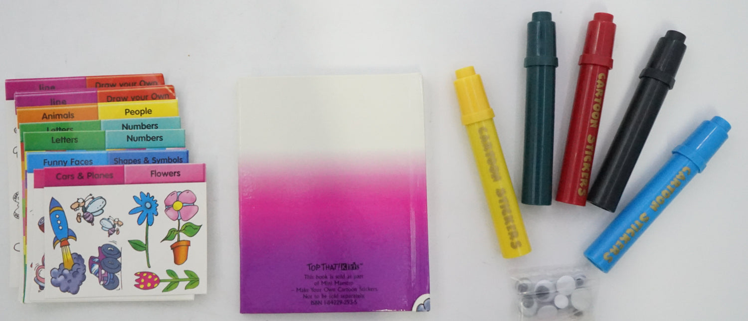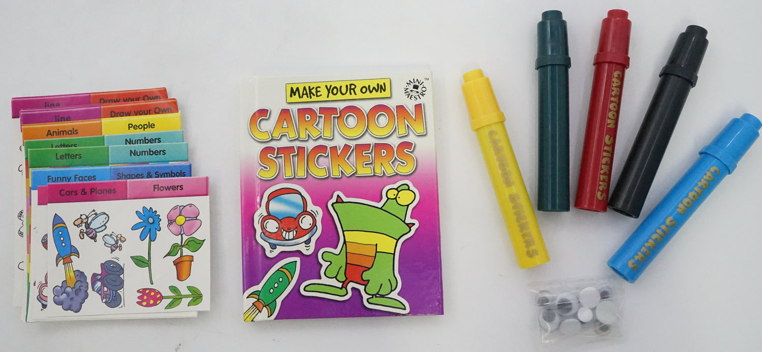 The kit includes five colouring pens, self-adhesive goggle eyes, 36 line-art stickers, 179 colour stickers and blank sticker paper.