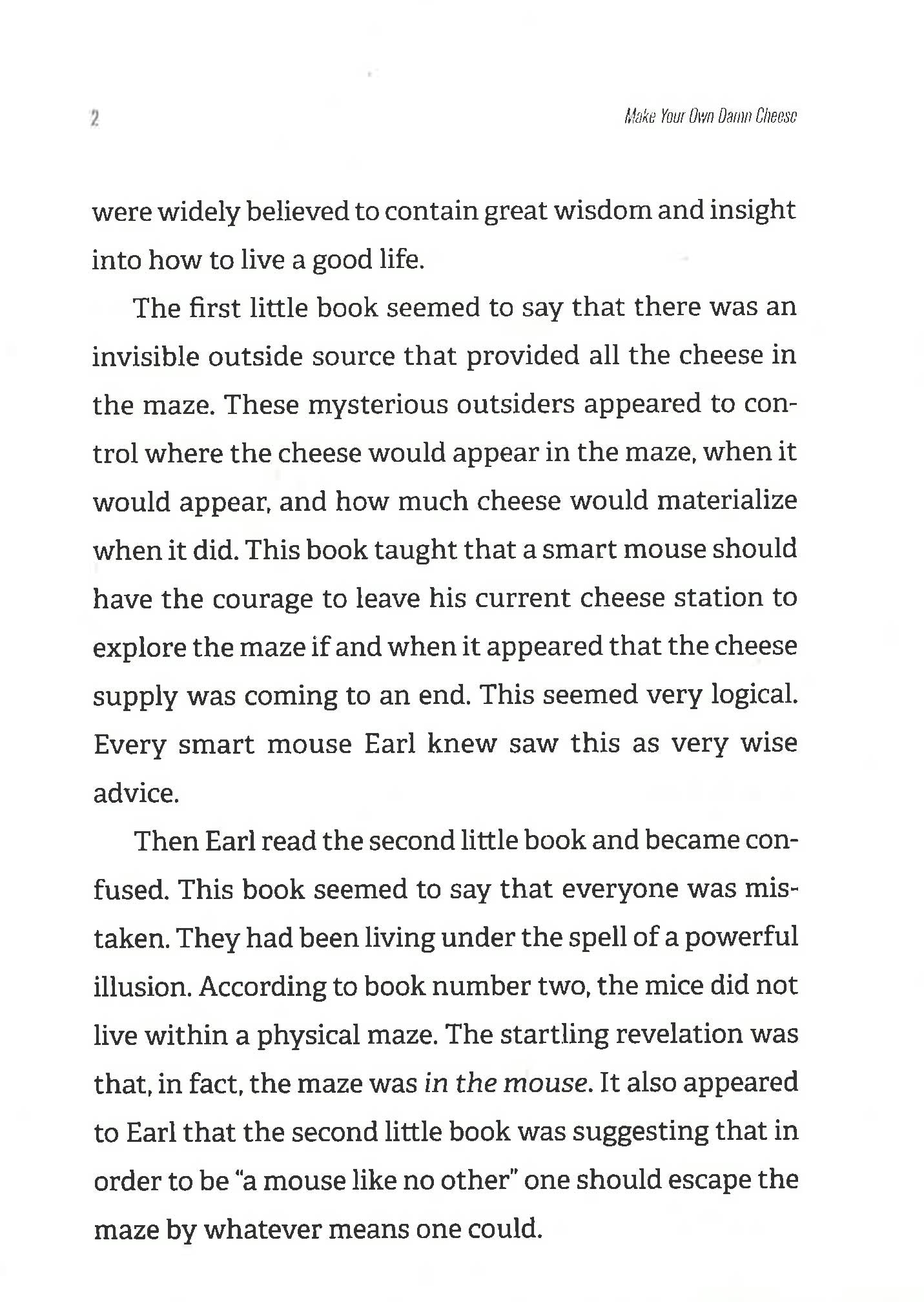 Earl is a curious young mouse who wonders ceaselessly about the maze into which he was born. In trying to escape the maze, he encounters dead ends no matter how hard he works. He yearns for a better life, filled with freedom and happiness. Earl desires more than the maze has to offer-a life where the cheese is plentiful and never out of reach. He believes he needs to get out of the maze, but how? In this delightful and compelling tale, you will follow Earl on his journey through the philosophies of the major players in the history of personal development. Learned mice Napoleon, Jim, Bob, Brian, Denis, and Price reveal to Earl how his mind looks and functions. They teach him how to master his own mind to design and create his own maze. He learns what cheese really is and why it is essential. Most importantly, Earl discovers who he really is and is joyfully astonished to learn the guiding principles that will revolutionize his life; he does not have to spend his days chasing cheese-he learns to make his own damn cheese! The powerful concepts in this gem of a book will put you on a path out of the mundane and allow you to fulfill your true and immense potential.