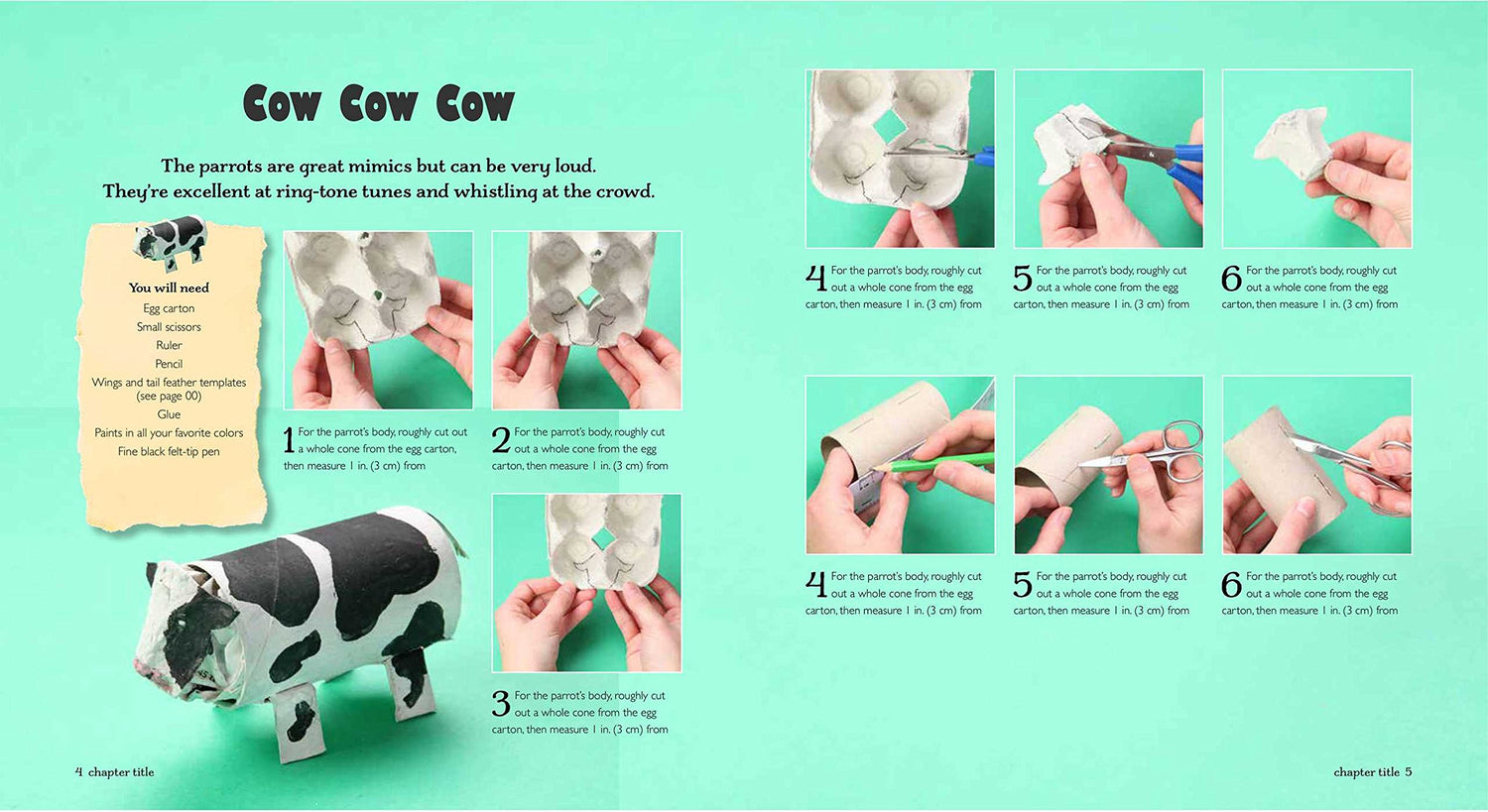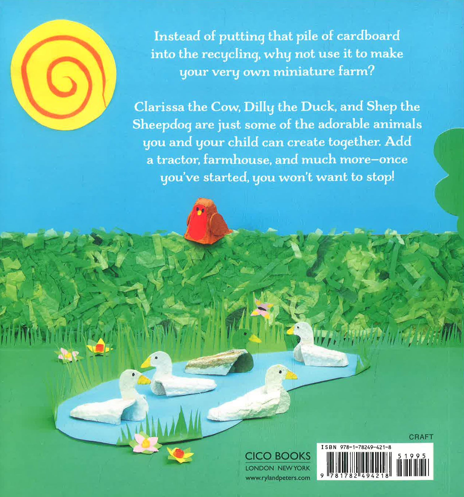 Finally in Chapter 4, Machinery and Scenery, there’s plenty of pretty farm scenery to make, such as a pond, trees, grass, and flowers, as well as that all-important farm equipment. Every project is made using simple step-by-step instructions, with handy tips throughout. Parents will delight in creating this wonderful farm with their children and never look at a cardboard tube or empty egg carton in the same way again!