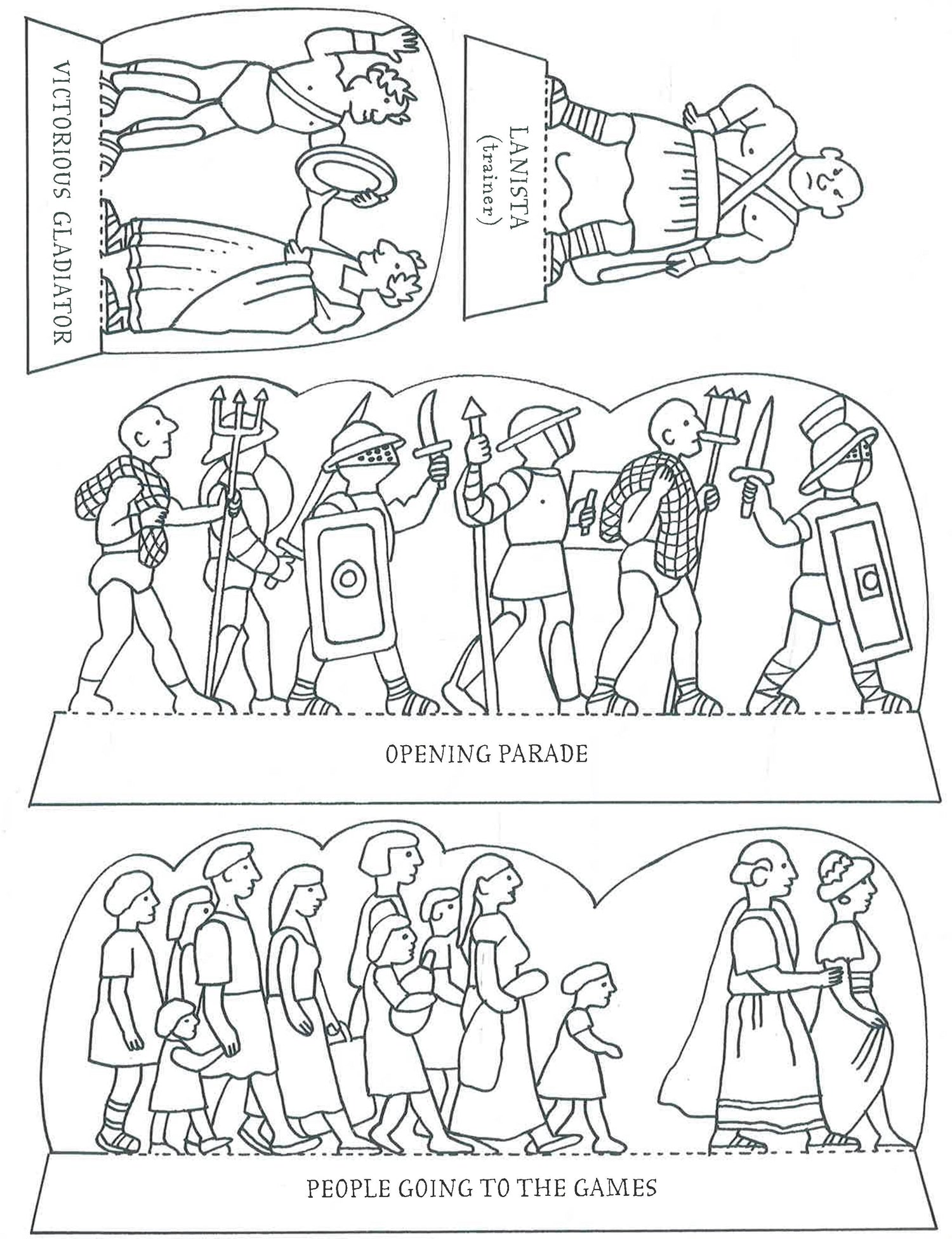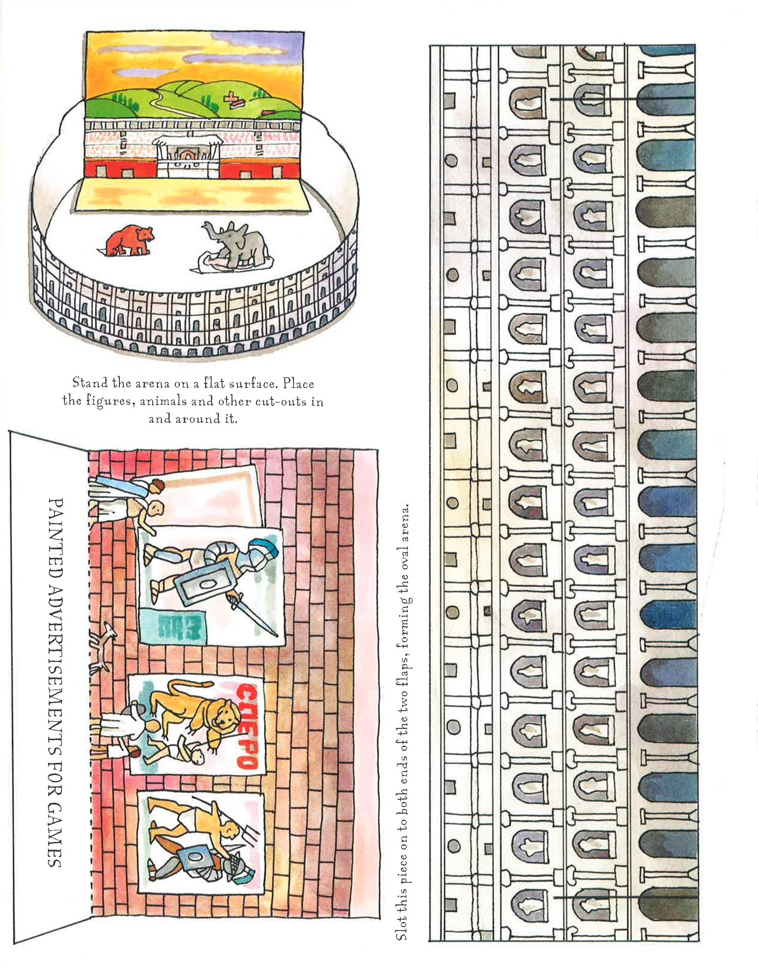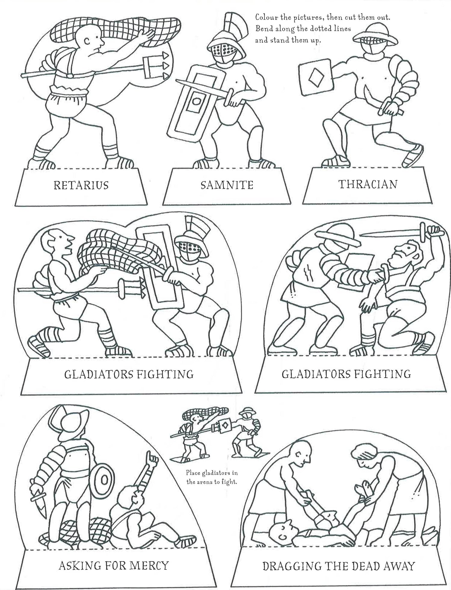 Fold out the back cover, stick down the sides and - hey presto! - a Roman Arena. Cut out and colour the backdrops and the black and white figures to stage your very own gladiator scenes.