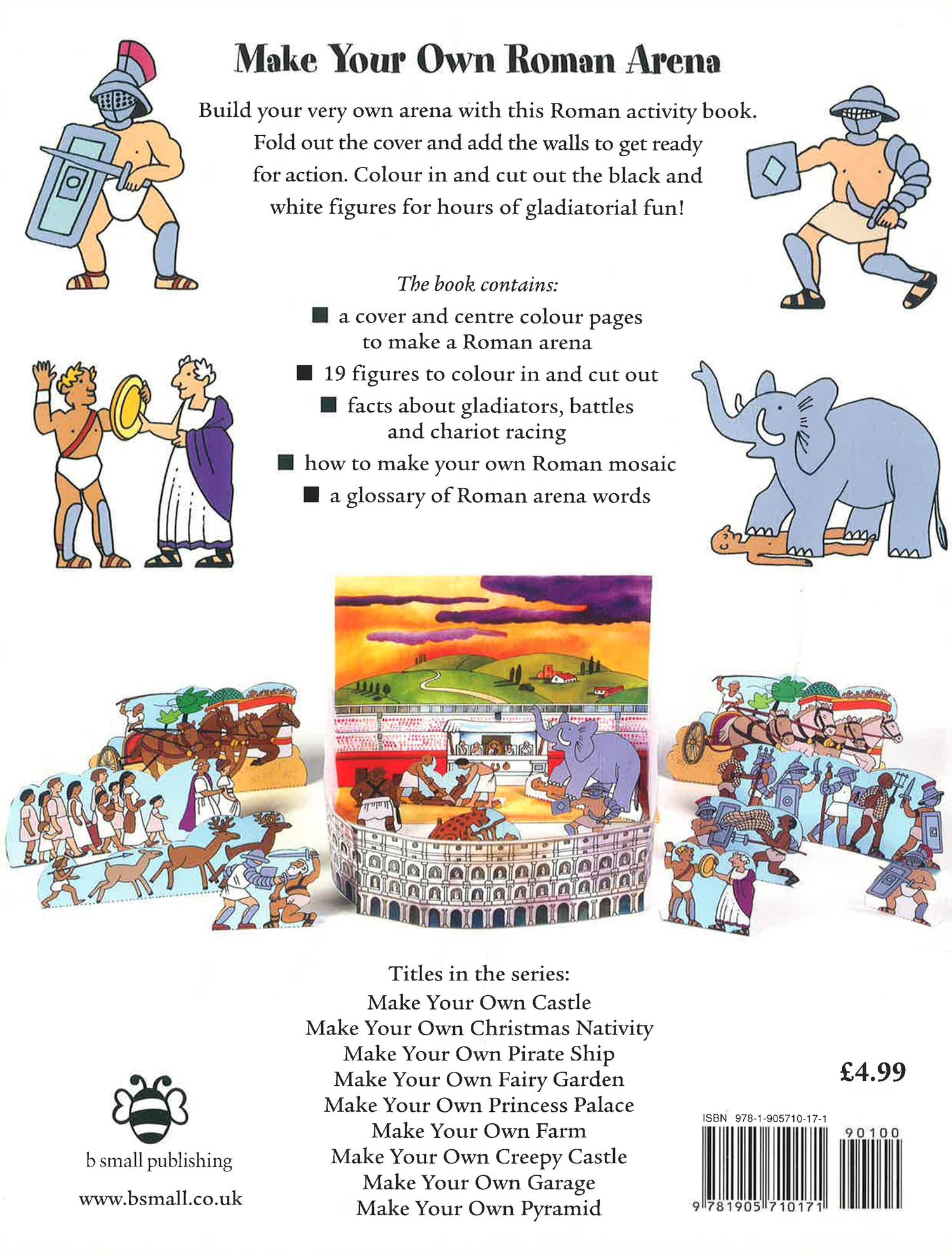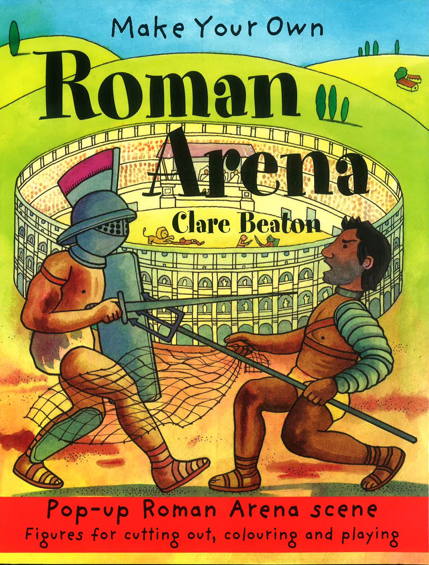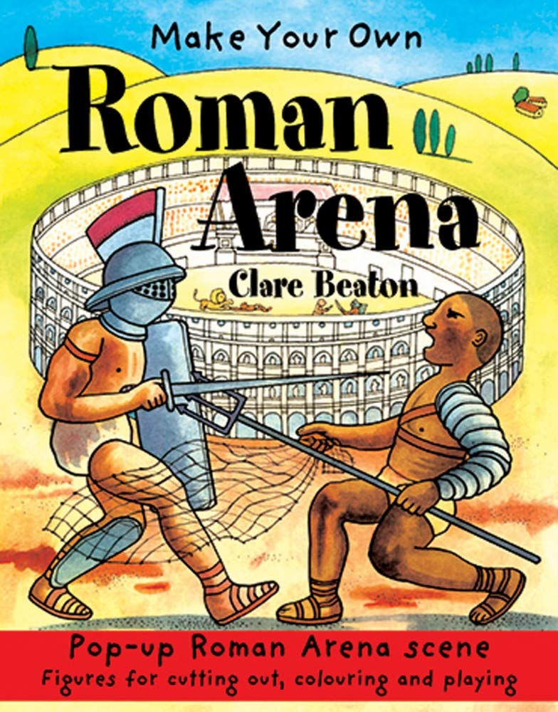 Fold out the back cover, stick down the sides and - hey presto! - a Roman Arena. Cut out and colour the backdrops and the black and white figures to stage your very own gladiator scenes.