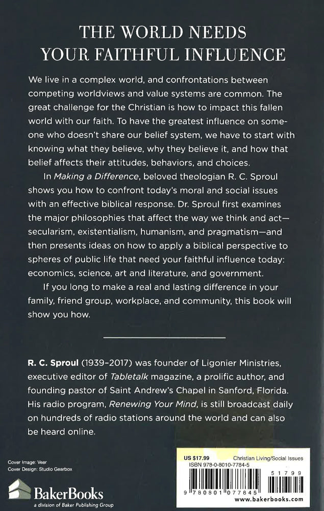 The great challenge for the Christian in a post-Christian context is how to impact this fallen world with our faith. In Making a Difference, beloved theologian R. C. Sproul shows readers how to confront today's moral and social issues with an effective biblical response. Dr. Sproul first examines the major philosophies that affect the way Americans think and act--secularism, existentialism, humanism, and pragmatism--and then presents ideas on how to apply a biblical perspective to spheres of public life that need the Christian's influence today: economics, science, art and literature, and government.