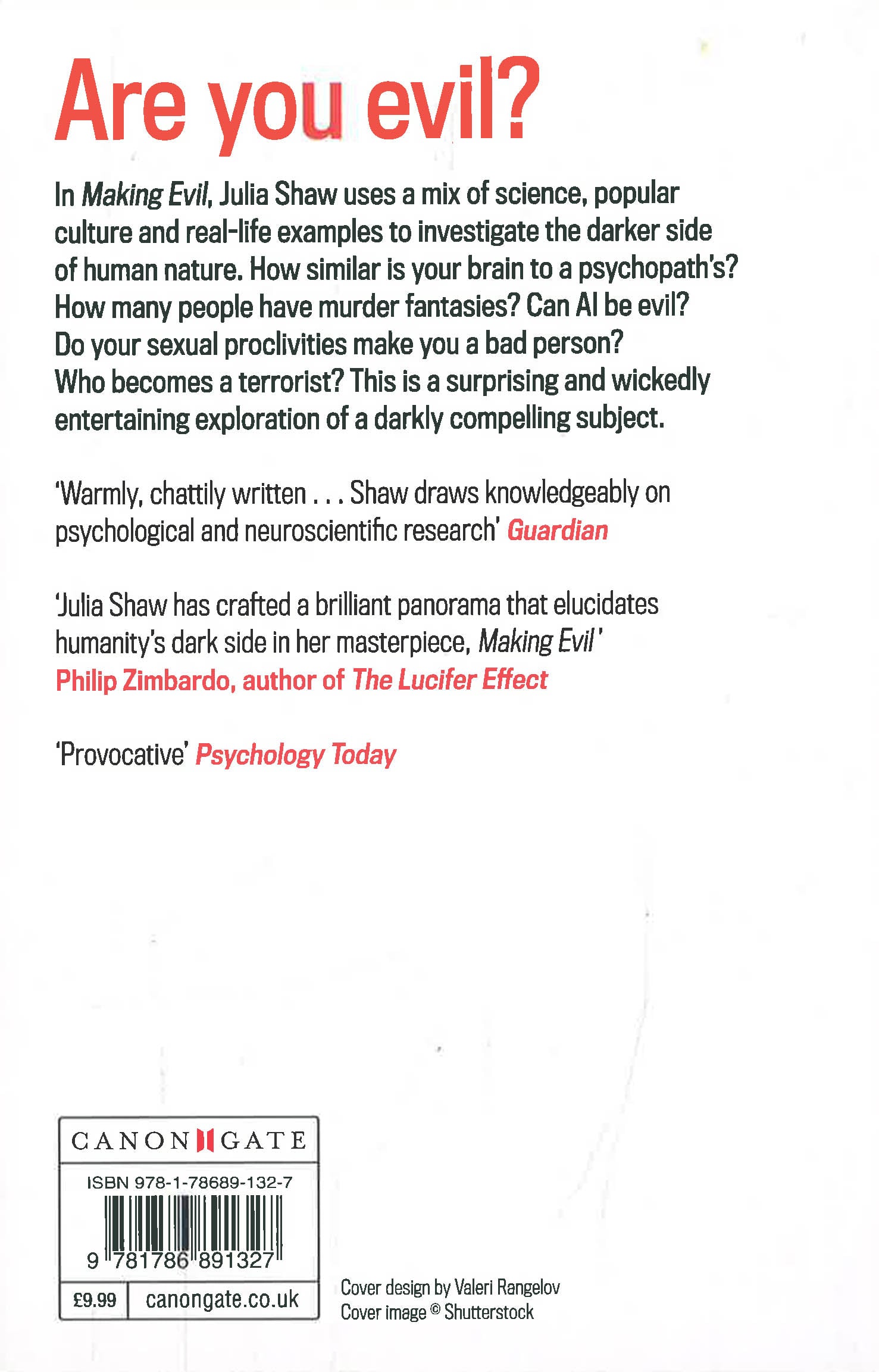 In Making Evil, Julia Shaw uses a mix of science, popular culture and real-life examples to investigate the darker side of human nature. How similar is your brain to a psychopath's? How many people have murder fantasies? Can AI be evil? Do your sexual proclivities make you a bad person? Who becomes a terrorist? This is a surprising and wickedly entertaining exploration of a darkly compelling subject.