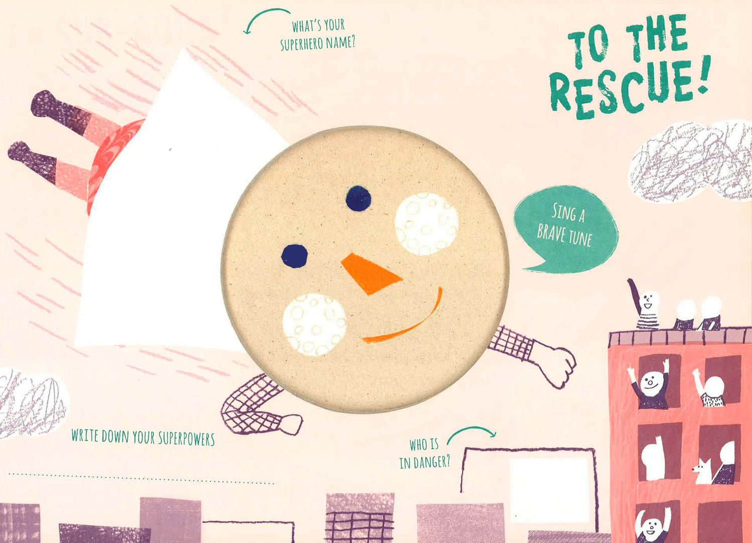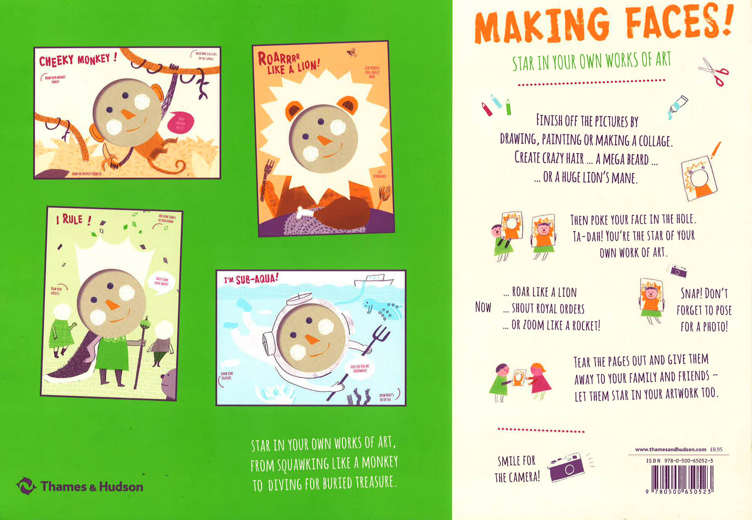 Based on the idea of a photo booth - where masks and other props set the scene for entertaining photographs - Making Faces! is a hands-on, fill-in art pad that allows children ages three and up to use their imagination to complete a picture, then tear off the sheet and poke their face through the hole, posing for the camera if they choose. They can turn themselves into kings and queens wearing crowns, astronauts wearing bubble helmets, and flowers with pretty petals. They color in floppy ears to become rabbits, shaggy manes to become lions, and pointy horns to become dinosaurs. Each of the thirty-two activity pages has a theme or suggestion such as Im the captain! or Im Monster-ous! with simple drawings such as fish or googly eyes that serve as a guide and suggestions on how children can make each illustration their own.