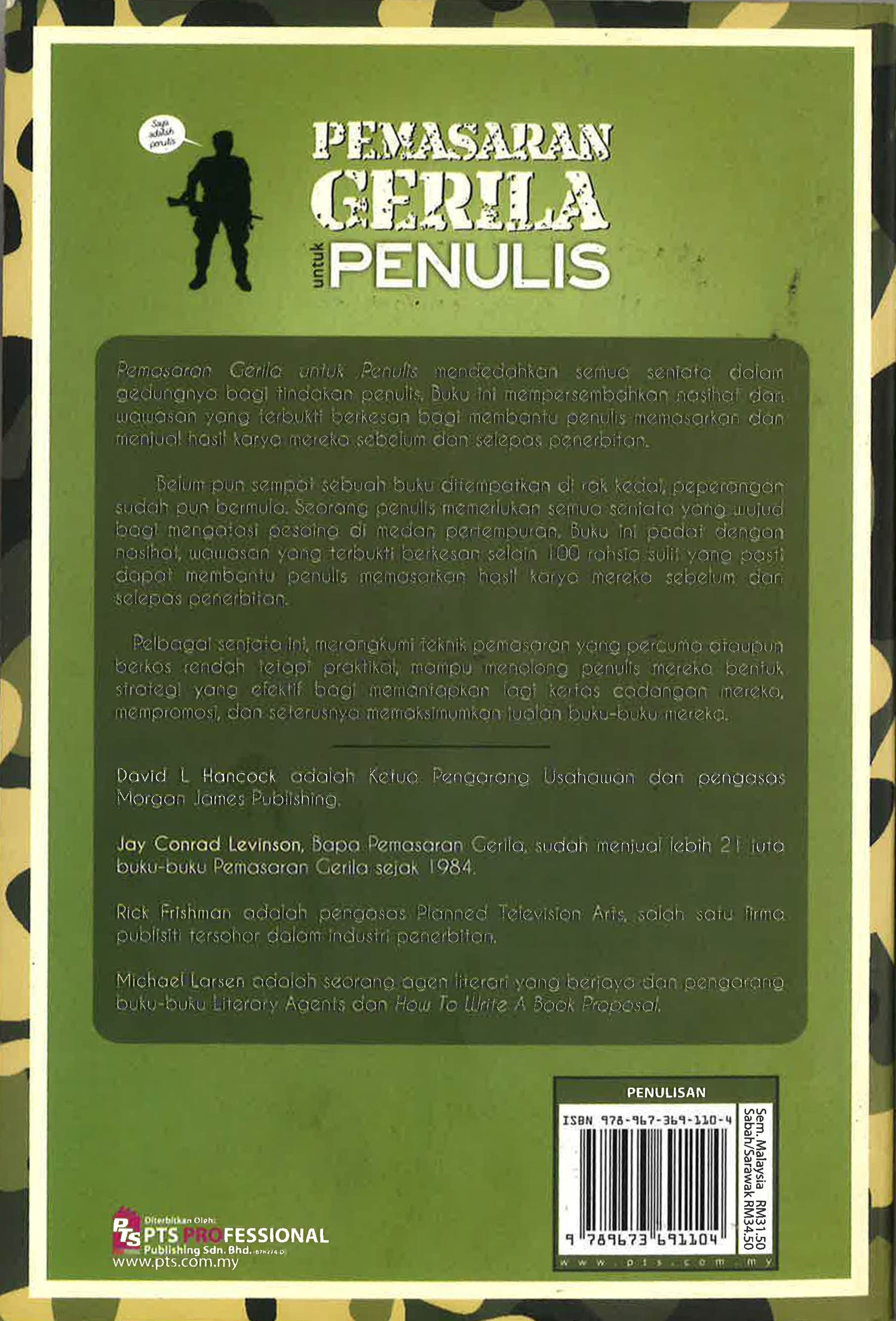 Pemasaran Gerila untuk penulis mendedahkan semuo senjata dolam oedunanya bagi tindakan penulis Buku ini mempersemba nasihat dan wowasan yang terbukti berkesan bagi membantu penulis memasarkan dan menjual hasil karya mereka sebelum dan selepas penerbitan. Belum pun sempat sebuah buku ditempatkan di rak kedal peperangan sudah pun bermula. Seorang penulis memerlukan semua senjata yang wujud bagi mengatasi pesaina di medan pertempuran Buku ini padat dengan nasihat wawasan yang terbukti berkesan selain 100 rahsia sulit yang pasti dapat membantu penulis memasarkan hasil karya mereka sebelum dan selepas penerbitan. Pelbagal senjata ini merangkumi teknik pemasaran yang percuma ataupun berkos rendah tetapi praktika mampu menolong penulis mereka bentuk strategi yang efektif bagi memantapkan lagi kertas cadangan mereka mempromosi dan seterusnya memaksimumkan jualan buku-buku mereka.