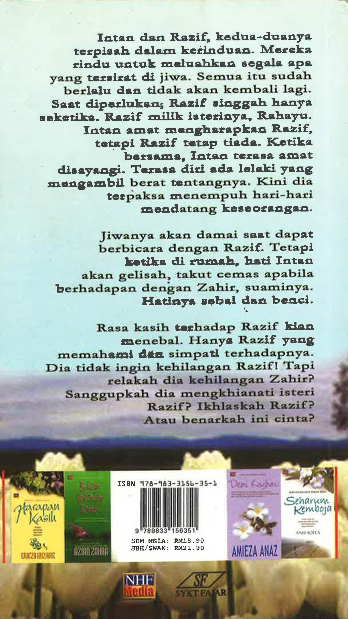 Intan dan Razif, kedua-duanya terpisah dalam kerinduan. Mereka rindu untuk meluahkan segala apa yang tersirat di jiwa. Semua itu sudah berlalu dan tidak akan kembali lagi. Saat diperlukan, Razif singgah hanya seketika. Razif milik isterinya, Rahayu. Intan amat mengharapkan Razif, tetapi Razif tetap tiada. Ketika bersama, Intan terasa amat disayangi. Terasa diri ada lelaki yang mengambil berat tentangnya. Kini dia terpaksa menempuh hari-hari mendatang keseorangan. Jiwanya akan damai saat dapat berbicara dengan Razif. Tetapi ketika di rumah, hati Intan akan gelisah, takut cemnas apabila berhadapan dengan Zahir, suamninya. Hatinya sebal dan benci. Rasa kasih terhadap Razif kian menebal. Hanya Razif yang memahami dan simpati terhadapnya. Dia tidak ingin kehilangan Razif! Tapi relakah dia kehilangan Zahir? Sanggupkah dia mengkhianati isteri RazifP Ikhlaskah Razif? Atau benarkah ini cinta?
