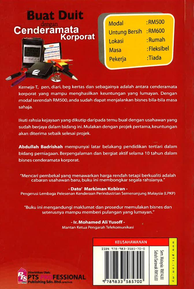 Ikuti rahsia Buat Duit dengan Cenderamata Korporat yang dikutip daripada temu bual dengan usahawan-usahawan yang hidup mewah dalam bidang ini. Sifat dan cara kerja bisnes cenderamata yang dipaparkan memudahkan pembaca menambah pendapatan sampingan dan mula berbisnes sebaik selesai membaca buku ini. Mulakan dengan projek pertama, keuntungan akan diterima sebaik selesai projek.