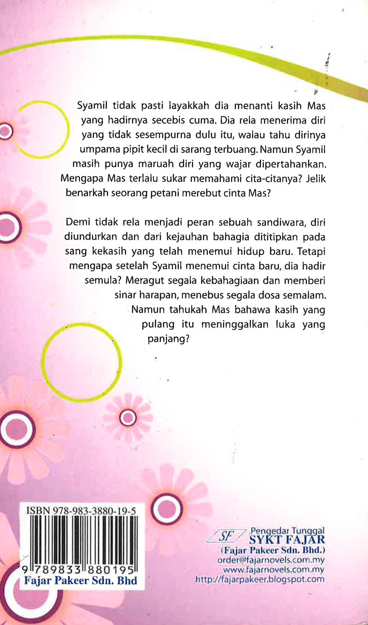 Syamil tidak pasti layakkah dia menanti kasih Mas yang hadirnya secebis cuma. Dia rela menerima diri yang tidak sesempurna dulu itu, walau tahu dirinya umpama pipit kecil di sarang terbuang. Namun Syamil masih punya maruah diri yang wajar dipertahankan. Mengapa Mas terlalu sukar memahami cita-citanya? Jelik benarkah seorang petani merebut cinta Mas? Demi tidak rela menjadi peran sebuah sandiwara, diri diundurkan dan dari kejauhan bahagia dititipkan pada sang kekasih yang telah menemui hidup baru. Tetapi mengapa setelah Syamil menemui cinta baru, dia hadir semula? Meragut segala kebahagiaan dan memberi sinar harapan, menebus segala dosa semalam. Namun tahukah Mas bahawa kasih yang pulang itu meninggalkan luka yang panjang?