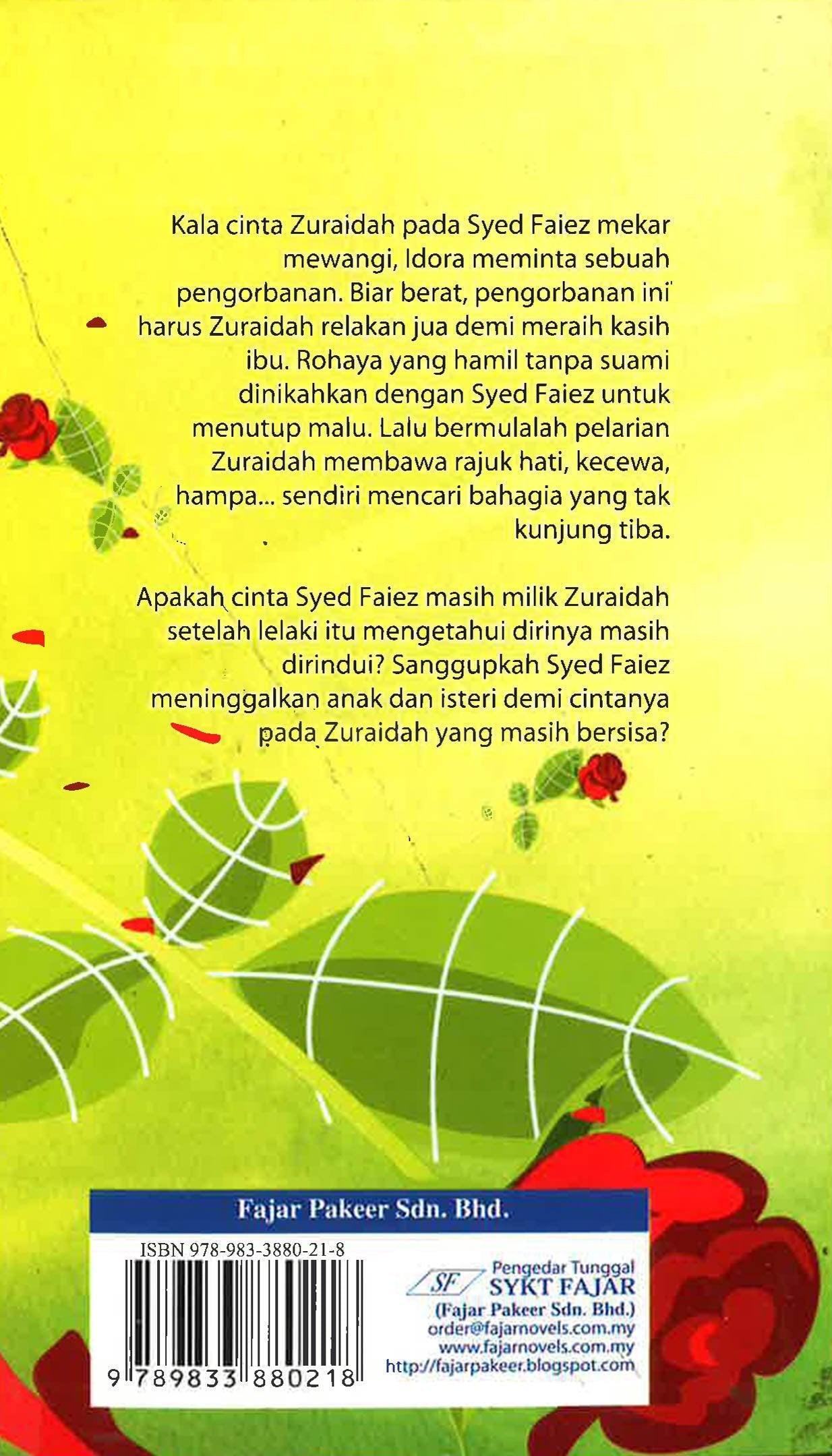 Kala cinta Zuraidah pada Syed Faiez mekar mewangi, Idora meminta sebuah pengorbanan. Biar berat, pengorbanan ini harus Zuraidah relakan jua demi meraih kasih ibu. Rohaya yang hamil tanpa suami dinikahkan dengan Syed Faiez untuk menutup malu. Lalu bermulalah pelarian Zuraidah membawa rajuk hati, kecewa, hampa... sendiri mencari bahagia yang tak kunjung tiba. Apakah cinta Syed Faiez masih milik Zuraidah setelah lelaki itu mengetahui dirinya masih dirindui? Sanggupkah Syed Faiez meninggalkan anak dan isteri demi cintanya pada Zuraidah yang masih bersisa?