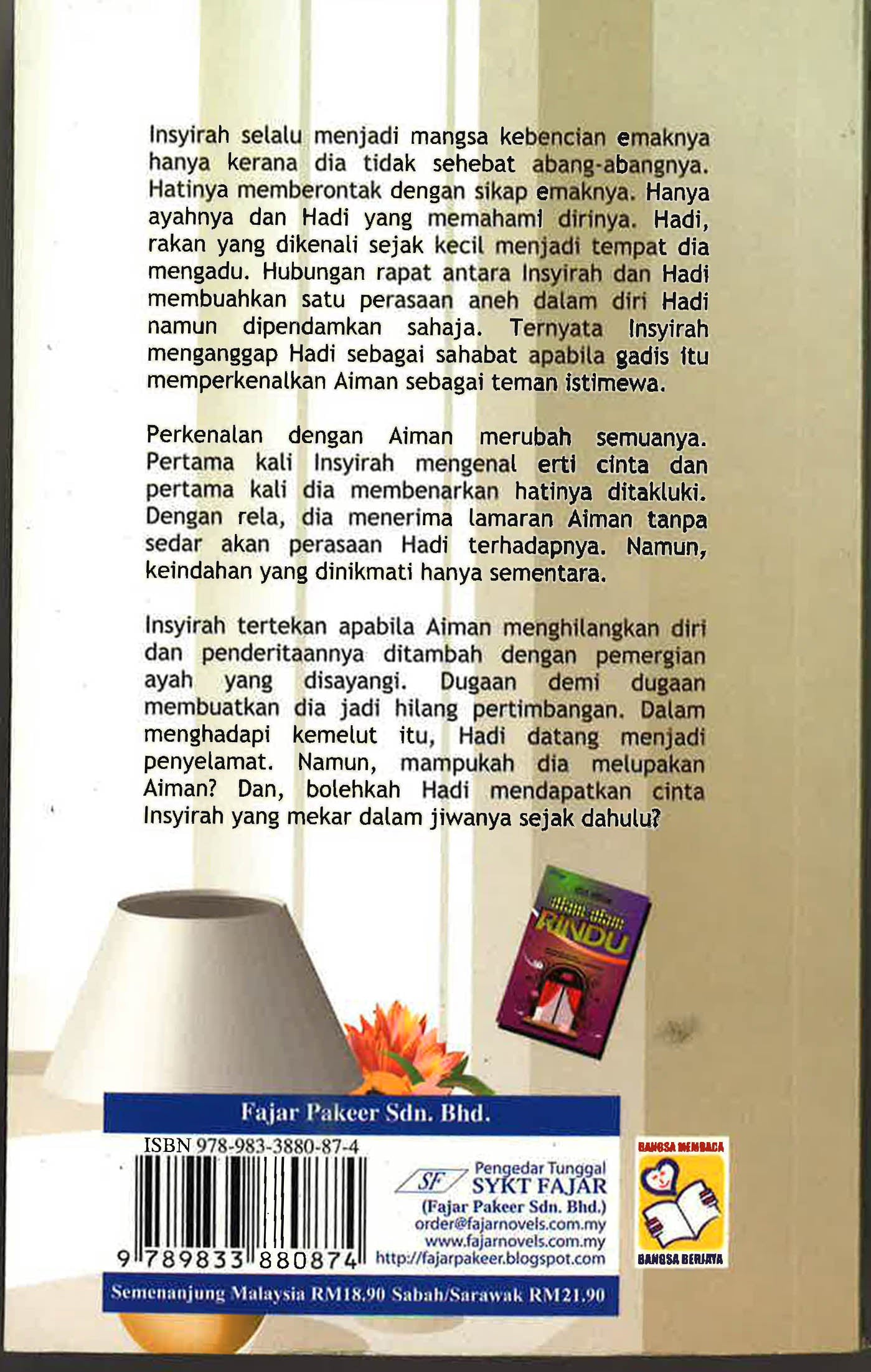 Insyirah selalu menjadi mangsa kebencian emaknya hanya kerana dia tidak sehebat abang-abangnya. Hatinya memberontak dengan sikap emaknya. Hanya ayahnya dan Hadi yang memahami dirinya. Hadi, rakan yang dikenali sejak kecil menjadi tempat dia mengadu. Hubungan rapat antara Insyirah dan Hadi membuahkan satu perasaan aneh dalam diri Hadi namun dipendamkan sahaja. Ternyata Insyirah menganggap Hadi sebagai sahabat apabila gadis itu memperkenalkan Aiman sebagai teman istimewa. Perkenalan dengan Aiman merubah semuanya. Pertama kali Insyirah mengenal erti cinta dan pertama kali dia membenarkan hatinya ditakluki. Dengan rela, dia menerima lamaran Aiman tanpa sedar akan perasaan Hadi terhadapnya. Namun, keindahan yang dinikmati hanya sementara. Insyirah tertekan apabila Aiman menghilangkan diri dan penderitaannya ditambah dengan pemergian ayah yang disayangi. Dugaan demi dugaan membuatkan dia jadi hilang pertimbangan. Dalam menghadapi kemelut itu, Hadi datang menjadi penyelamat. Namun, mampukah dia melupakan Aiman? Dan, bolehkah Hadi mendapatkan cinta Insyirah yang mekar dalam jiwanya sejak dahulu?