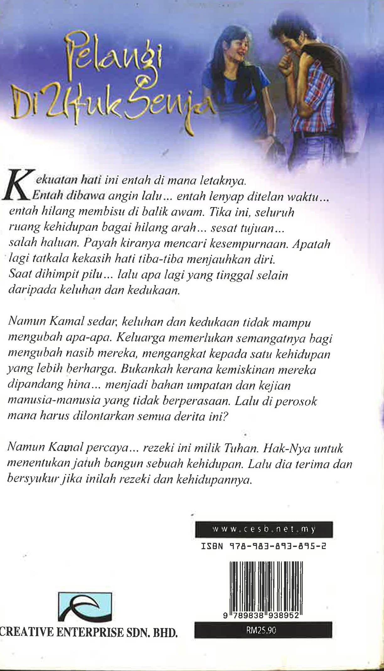 Kekuatan hati ini entah di mana letaknya.Entah dibawa angin lalu.. entah lenyap ditelan waktu... entah hilang membisu di balik awam. Tika ini, seluruh ruang kehidupan bagai hilang arah... sesat tujuan. salah haluan. Payah kiranya mencari kesempurnaan. Apatah lagi tatkala kekasih hati tiba-tiba menjauhkan diri. Saat dihimpit pilu.. lalu apa lagi yang tinggal selain daripada keluhan dan kedukaan. Namun Kamal sedar, keluhan dan kedukaan tidak mampu mengubah apa-apa. Keluarga memerlukan semangatnya bagi mengubah nasib mereka, mengangkat kepada satu kehidupan yang lebih berharga. Bukankah kerana kemiskinan mereka dipandang hina.. menjadi bahan umpatan dan kejian manusia-manusia yang tidak berperasaan. Lalu di perosok mana harus dilontarkan semua derita ini? Namun Kamal percaya... rezeki ini milik Tuhan. Hak-Nya untuk menentukan jatuh bangun sebuah kehidupan. Lalu dia terima dan bersyukur jika inilah rezeki dan kehidupannya.