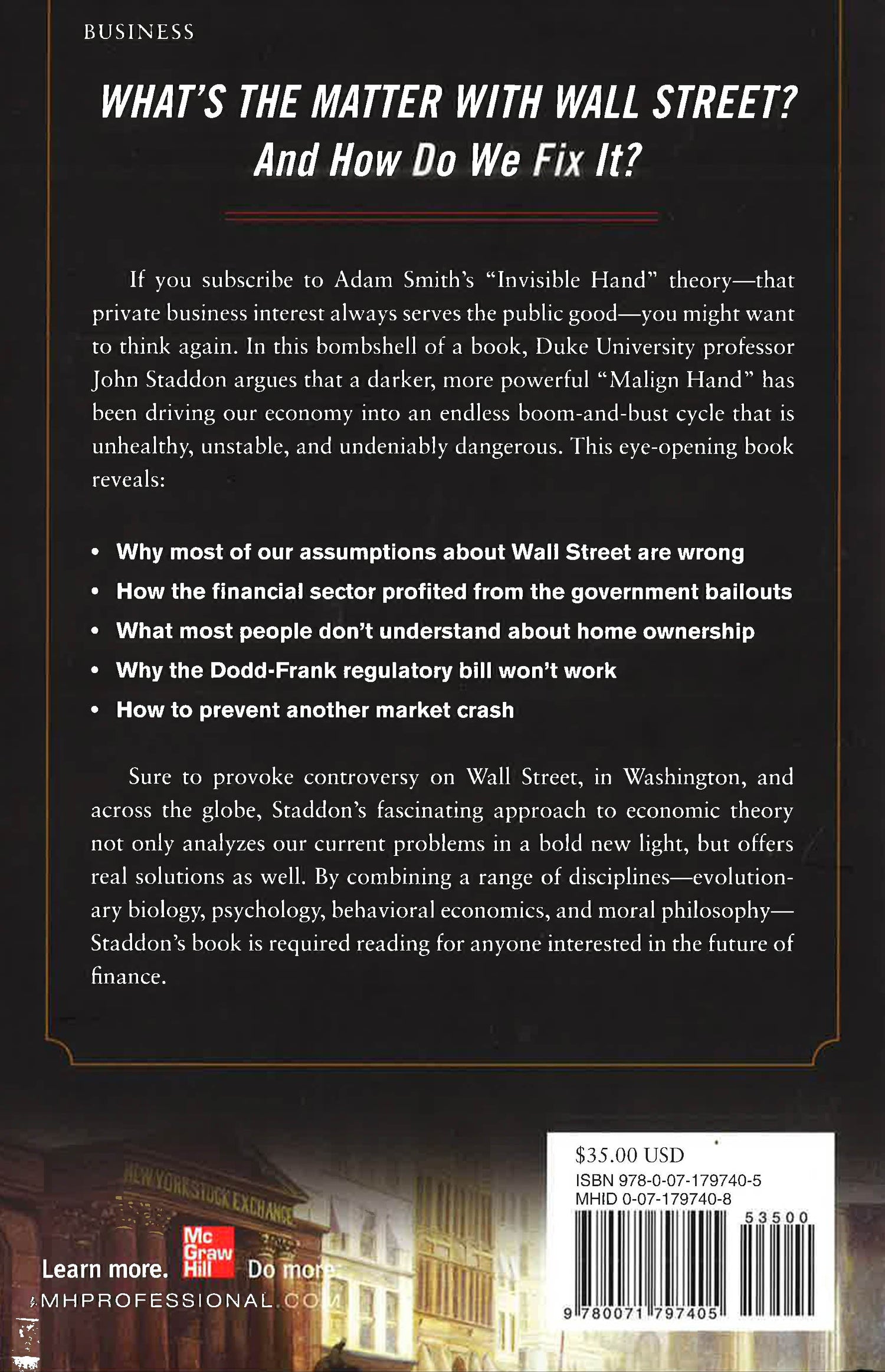 Even after the global financial meltdown of 2008, economists have clung to Adam Smith's "Invisible Hand" theory of an always selfregulating market that benefits private and public interests alike. But Duke University professor John Staddon is here to tell that there's also another, darker force at work on Wall Street-a "Malign Hand" that guides all human interactions, including our finances.