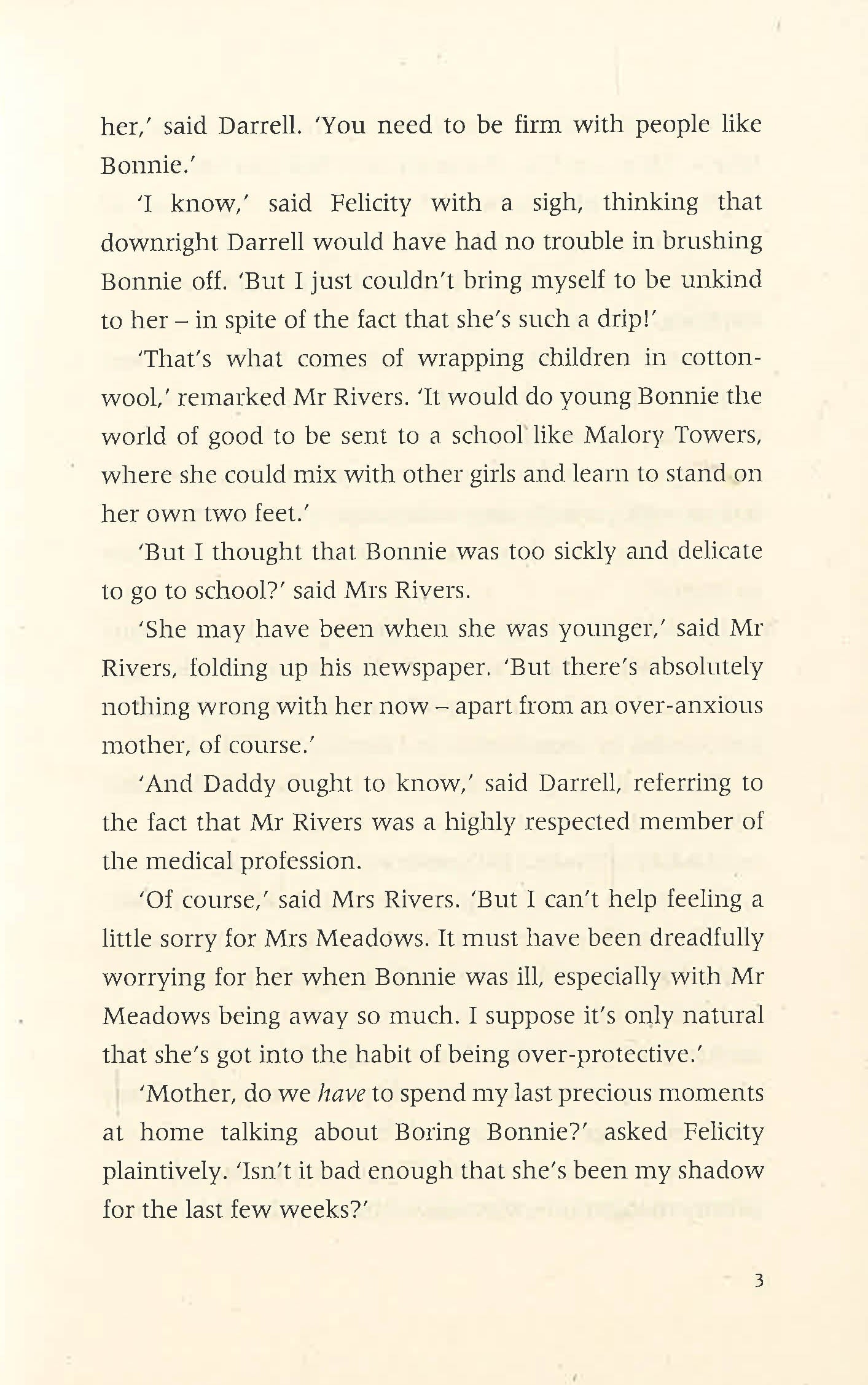 Darrell has left Malory Towers and her sister Felicity takes over as head girl. But the other girls are determined to cause trouble. Will Freddie and June ever stop playing tricks? And what's Amy's strange family secret?