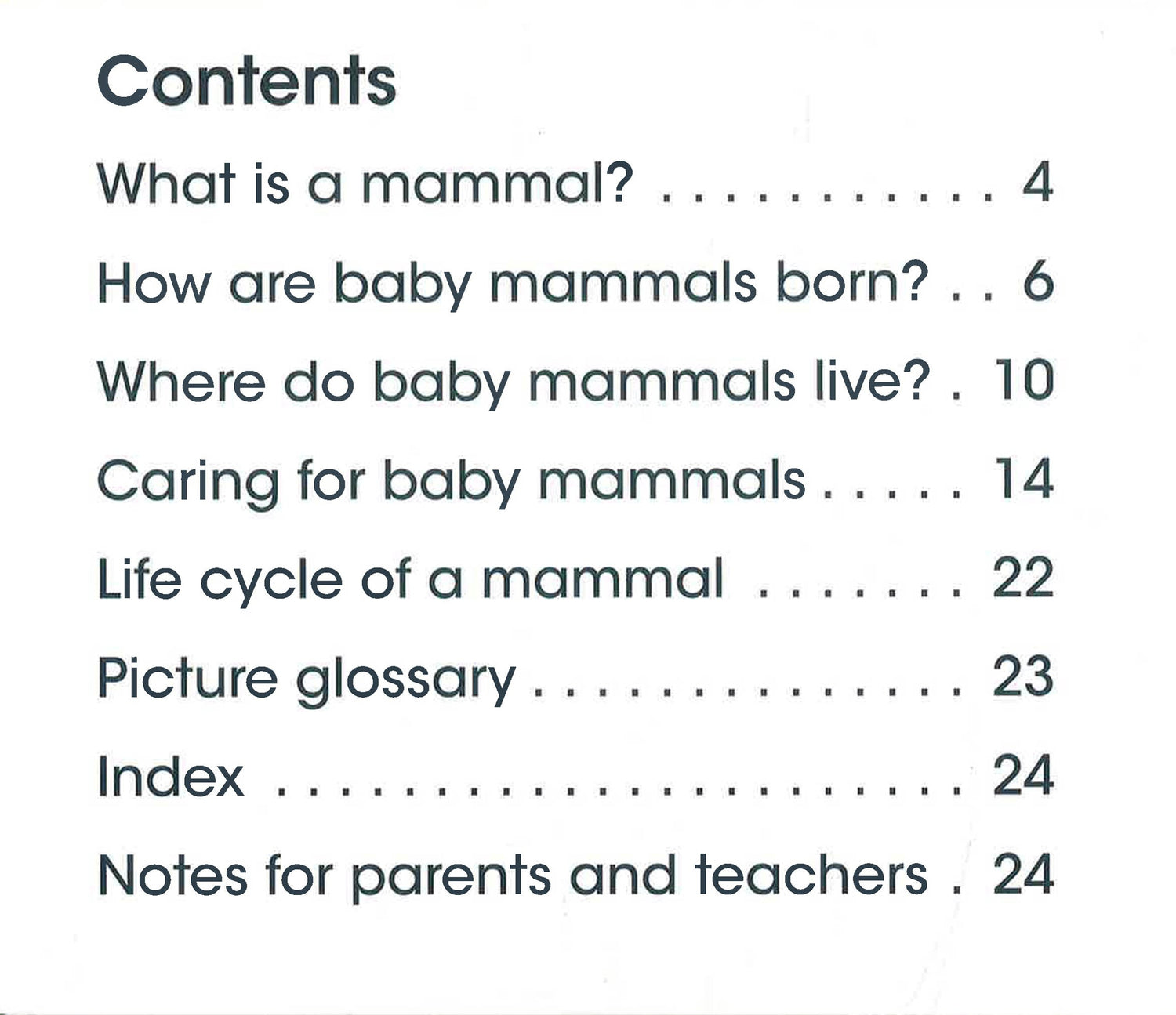 This title looks at mammal babies, and examines how mammal babies are born, how they are cared for, how they develop, and differences and similarities between baby mammals and their parents.