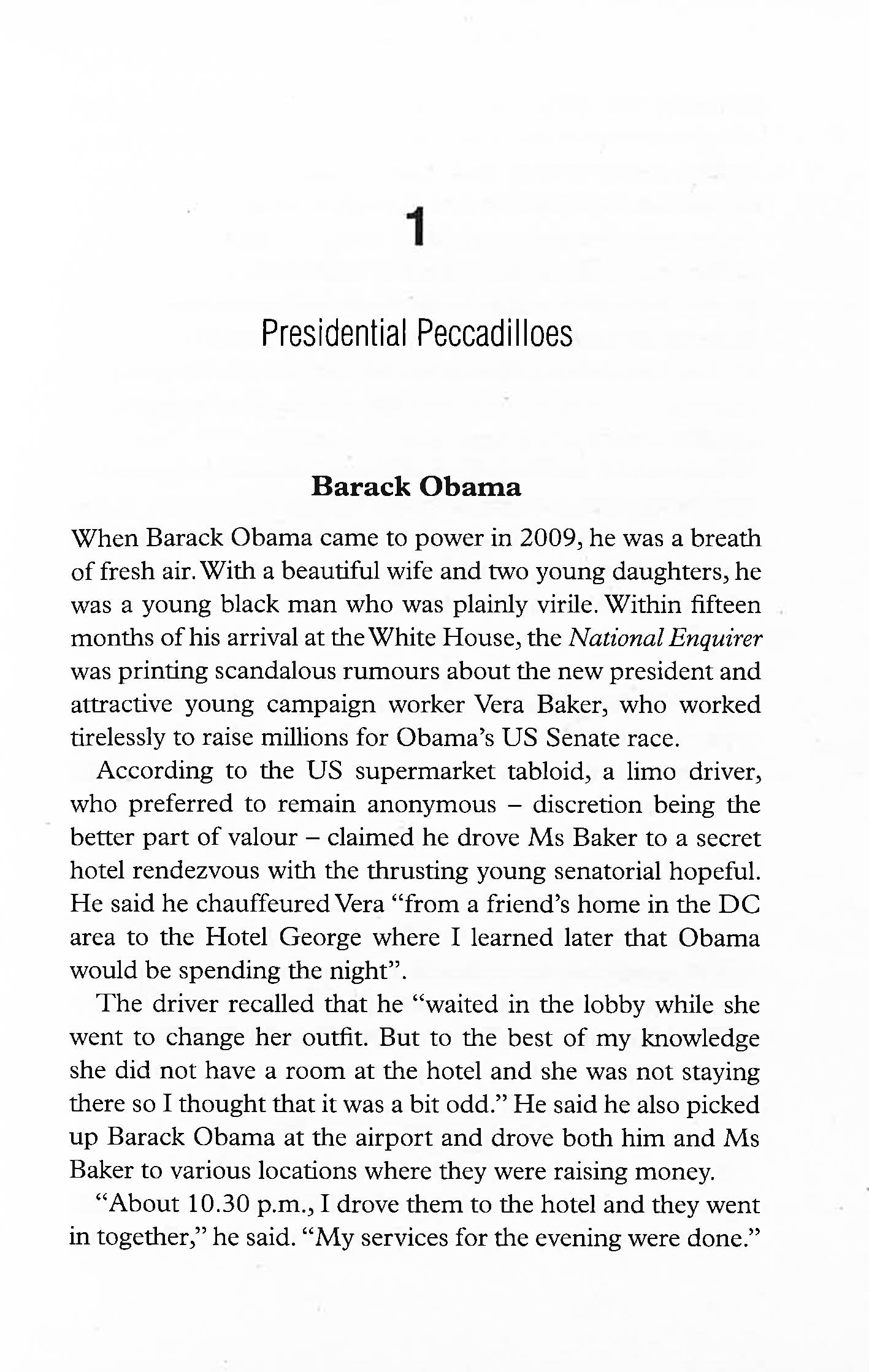 Sex scandals, some historical but many contemporary, involving political figures, celebrities, movie stars, sports stars, musicians and artists, from Julius Caesar's affair with Cleopatra, which scandalized Rome and may have contributed to his murder, to what exactly IMF head Dominique Strauss-Kahn did or didn't get up to in that New York hotel room. England's Edward II was put to death by having a red-hot poker shoved up 'those parts in which he had been wont to make his vicious pleasures' and James Dean was known as 'the human ashtray' for the pleasure he took in having cigarettes stubbed out on his body, but from Silvio Berlusconi to Tiger Woods, many have been more focused on pleasure than pain. Even Barack Obama gets a look in - did he have an affair with Vera Baker?