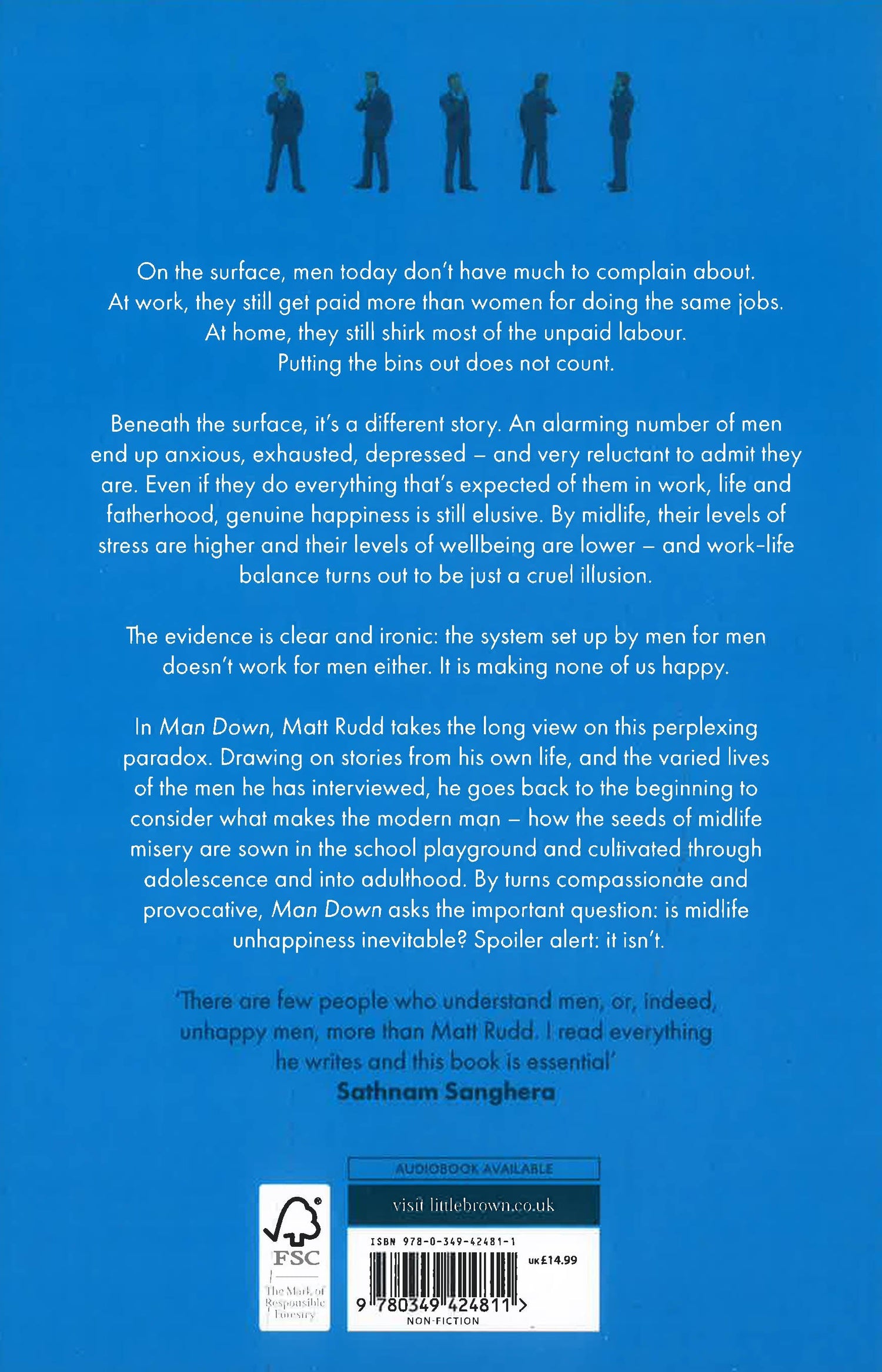 The most honest, most revealing - and funniest - exploration of male mental health I have ever read' Adam Kay'Matt Rudd may have written the most important book in a generation' Idle Society'A whole-hearted and important attempt to analyse what has gone wrong for so many men and to make some tentative suggestions for what may help' The Times'This book is essential' Sathnam Sanghera'I love everything Matt Rudd has ever written' Chris Evans'I loved it' Christine ArmstrongOn the surface, men today don't have much to complain about. At work, they still get paid more than women for doing the same jobs. At home, they still shirk most of the unpaid labour. Putting the bins out does not count.Beneath the surface, it's a different story. An alarming number of men end up anxious, exhausted, depressed - and very reluctant to admit they are. Even if they do everything that's expected of them in work, life and fatherhood, genuine happiness is still elusive. By midlife, their levels of stress are higher and their levels of wellbeing are lower - and work-life balance turns out to be just a cruel illusion.The evidence is clear and ironic: the system set up by men for men doesn't work for men either. It is making none of us happy.In Man Down, Matt Rudd takes the long view on this perplexing paradox. Drawing on stories from his own life, and the varied lives of the other men he has interviewed, he goes back to the beginning to consider what makes the modern man - how the seeds of midlife misery are sown in the school playground and cultivated through adolescence and into adulthood. By turns compassionate and provocative, Man Down asks the important question: is midlife unhappiness inevitable? Spoiler alert: it isn't.