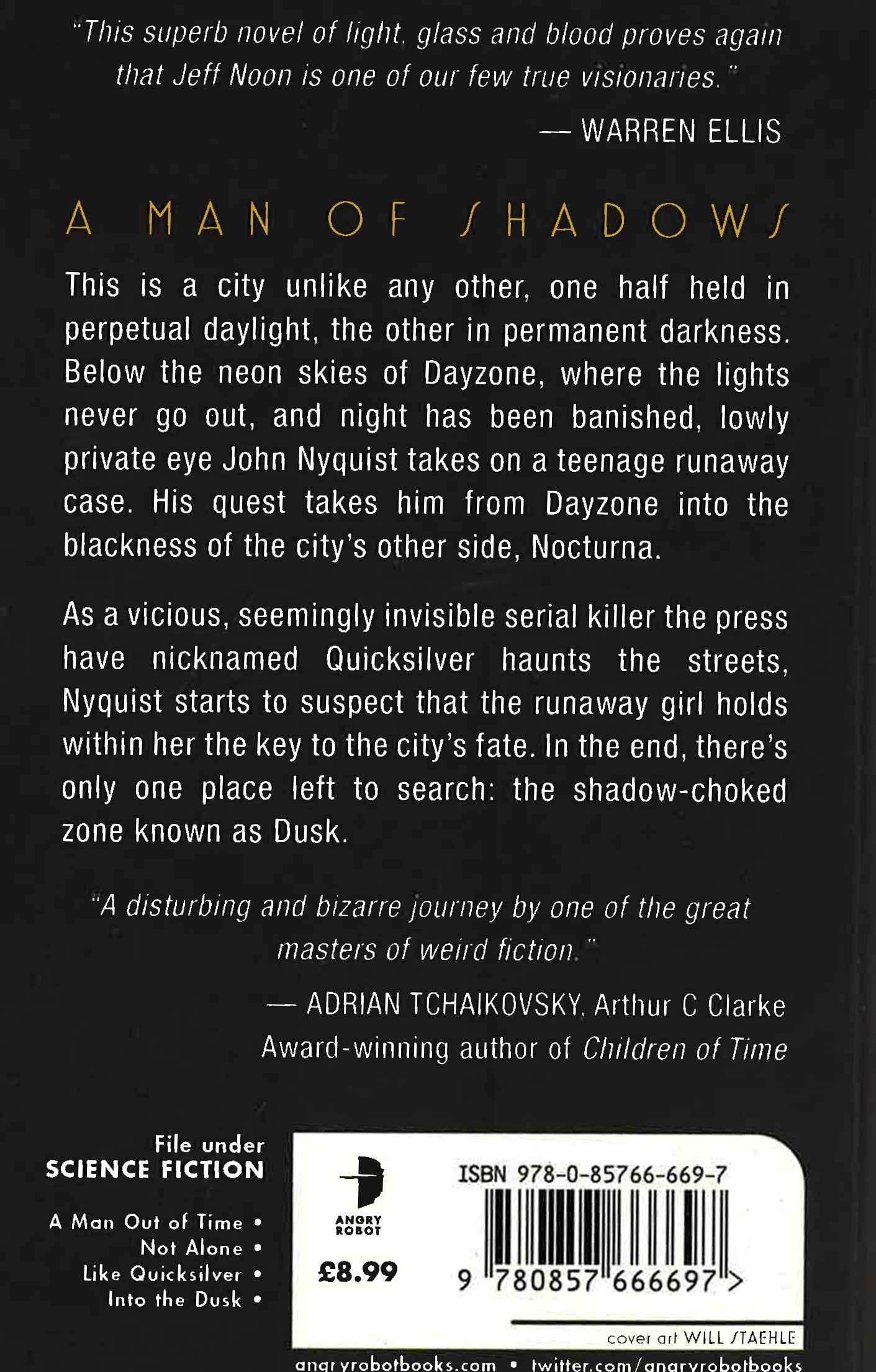 Below the neon skies of Dayzone -- where the lights never go out, and night has been banished -- lowly private eye John Nyquist takes on a teenage runaway case. His quest takes him from Dayzone into the permanent dark of Nocturna. As the vicious, seemingly invisible serial killer known only as Quicksilver haunts the streets, Nyquist starts to suspect that the runaway girl holds within her the key to the city's fate. In the end, there's only one place left to search: the shadow-choked zone known as Dusk. File Under: Science Fiction [ A Man Out of Time | Not Alone | Like Quicksilver | Into the Dusk ]