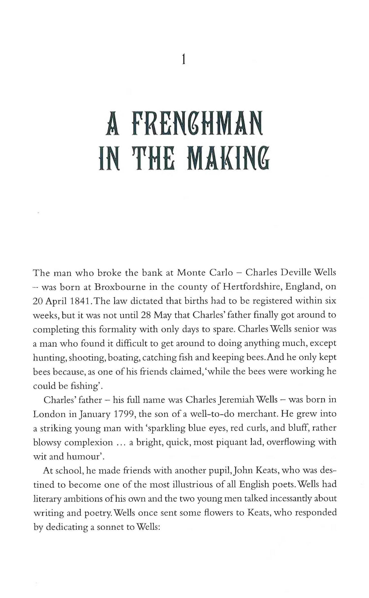 The Incredible true story of the man who broke the bank at Monte Carlo. Charles Deville Wells has two loves in his life: a beautiful French mistress named Jeannette and his sumptuous yacht, the Palais Royal. At the risk of losing them both, Wells stakes everything he owns at the roulette tables in Monte Carlo's world-famous casino - and in the space of a few days he breaks the bank, not once but ten times, winning the equivalent of millions in today's money. Is he phenomenally lucky? Has he really invented an `infallible' gambling system, as he claims? Or is he just an exceptionally clever fraudster? Based on painstaking research on both sides of the Channel and beyond, this biography reveals the incredible true story of the man who broke the bank at Monte Carlo - an individual who went on to become Europe's most wanted criminal, hunted by British and French police and known in the press as `Monte Carlo Wells the man with 36 aliases'.