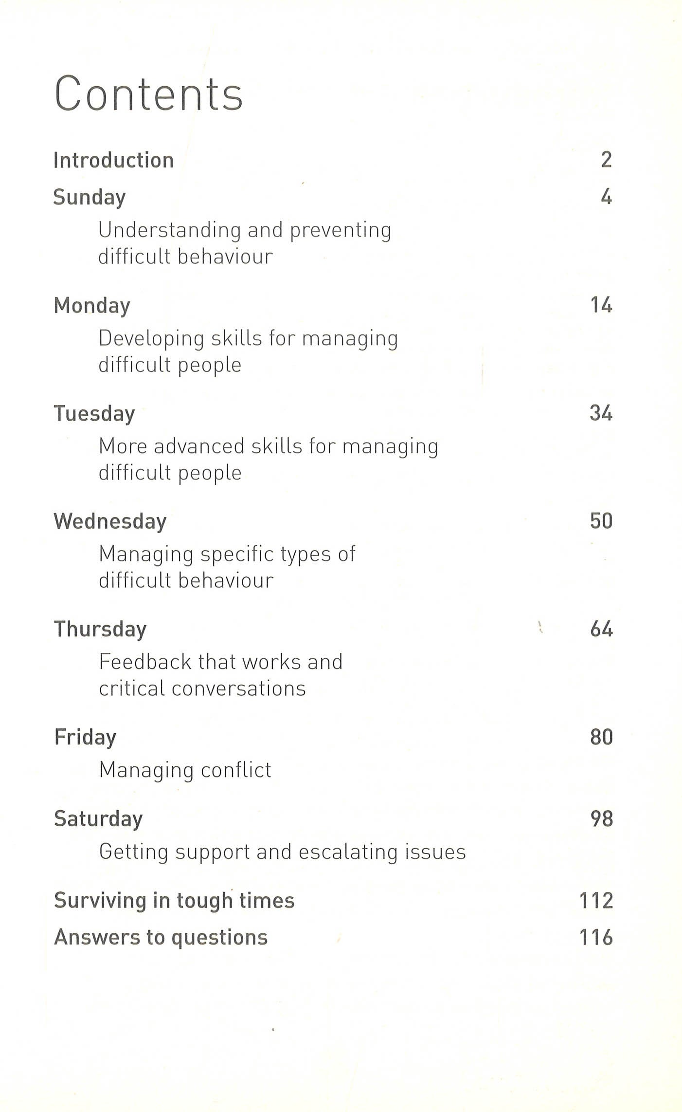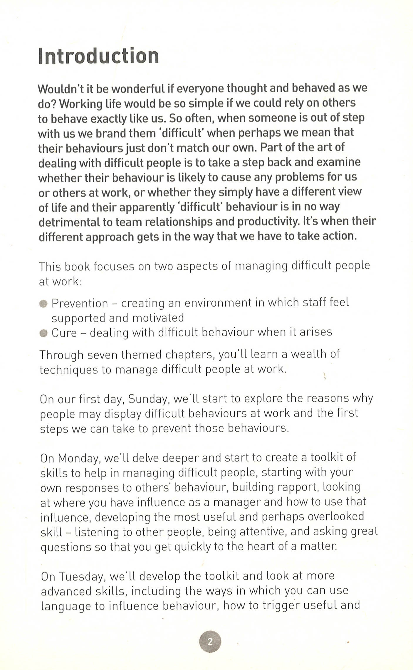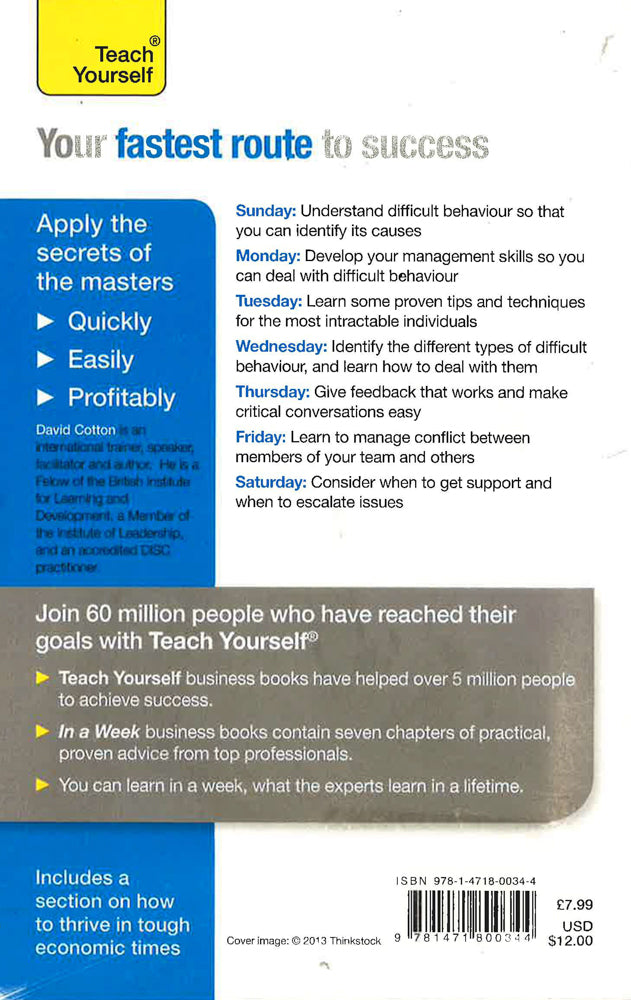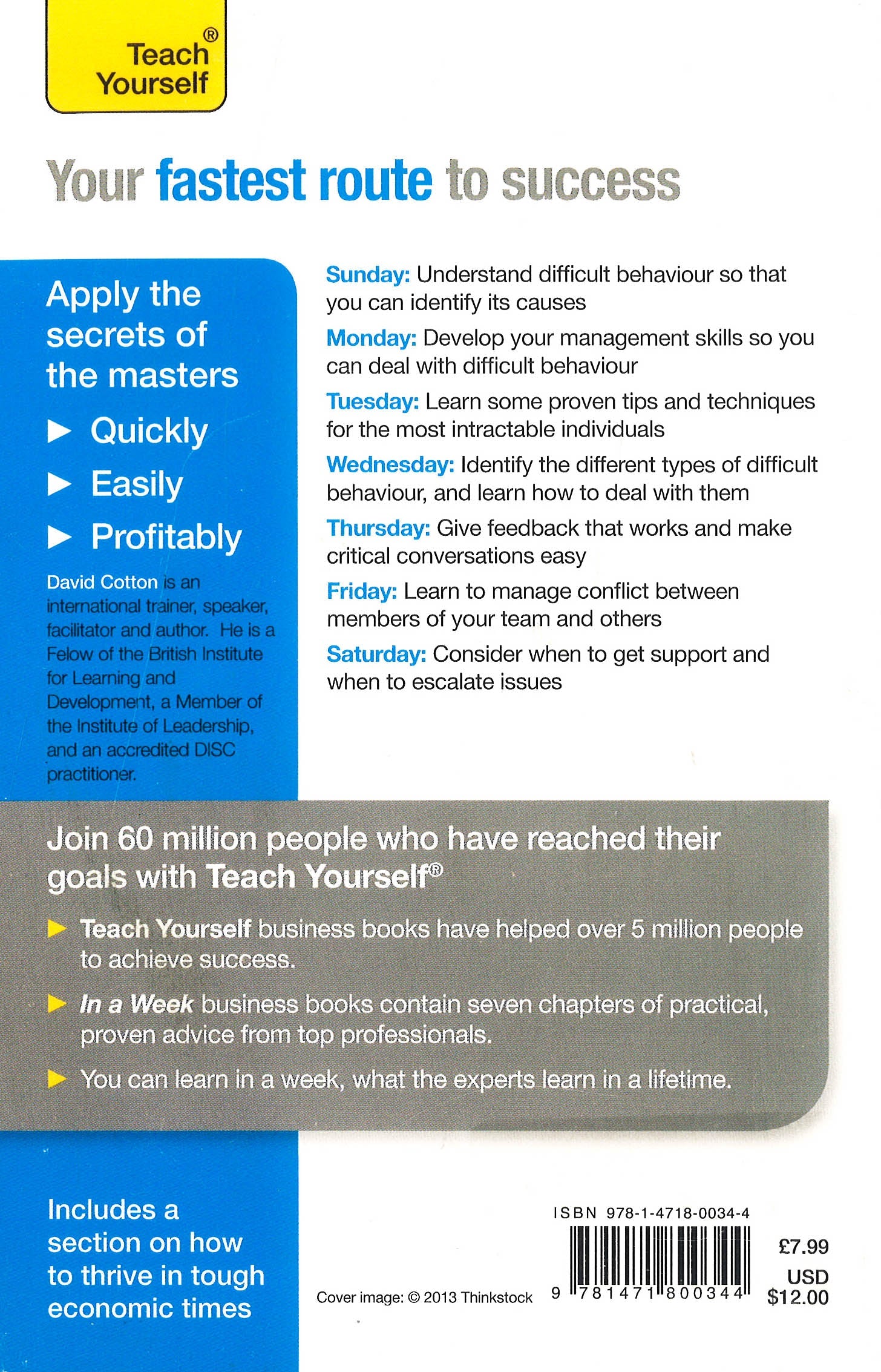 Managing Difficult People In A Week is a simple and straightforward guide to being a better manager, giving you everything you need to know in just seven short chapters. From preventing difficult behaviour to managing conflict, you'll discover the insider secrets you need to know in order to successfully manage difficult people.This book introduces you to the main themes and ideas of managing difficult people, giving you a basic knowledge and understanding of the key concepts, together with practical and thought-provoking exercises. Whether you choose to read it in a week or in a single sitting, Managing Difficult People In A Week is your fastest route to success:Sunday: Understanding and preventing difficult behaviourMonday: Developing your skills for managing difficult peopleTuesday: More advanced skills for managing difficult peopleWednesday: Managing specific types of difficult behaviourThursday: Feedback that works and critical converstionsFriday: Managing conflictSaturday: Getting support and escalating issuesABOUT THE SERIESIn A Week books are for managers, leaders, and business executives who want to succeed at work. From negotiating and content marketing to finance and social media, the In A Week series covers the business topics that really matter and that will help you make a difference today. Written in straightforward English, each book is structured as a seven-day course so that with just a little work each day, you will quickly master the subject. In a fast-changing world, this series enables readers not just to get up to speed, but to get ahead.