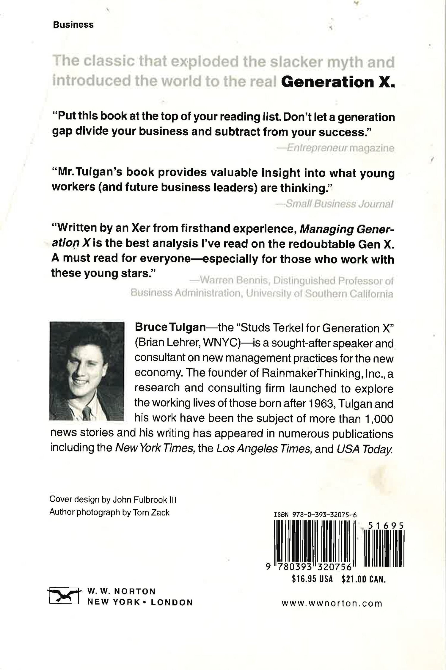 Managing Generation X explains Generation X to its employers. It tunes in to the free-agent mindset that has swept across the entire workforce and serves as the best source of information on a generation that is leaving an indelible mark on the culture of American business. GenXers' willingness to walk away from any unsatisfactory employment relationship launched the staffing crisis that plagues employers today--and has allowed them to become the most entrepreneurial generation in history. Managing Generation X shows employers how to tap this valuable, quirky labor pool. GenXers speak in verbatim interview narratives on almost every page, offering their firsthand experiences as well as concrete advice on how to manage them (and how not to). Through the clear lens of Managing Generation X, we can see the future of work and the workforce of the future.