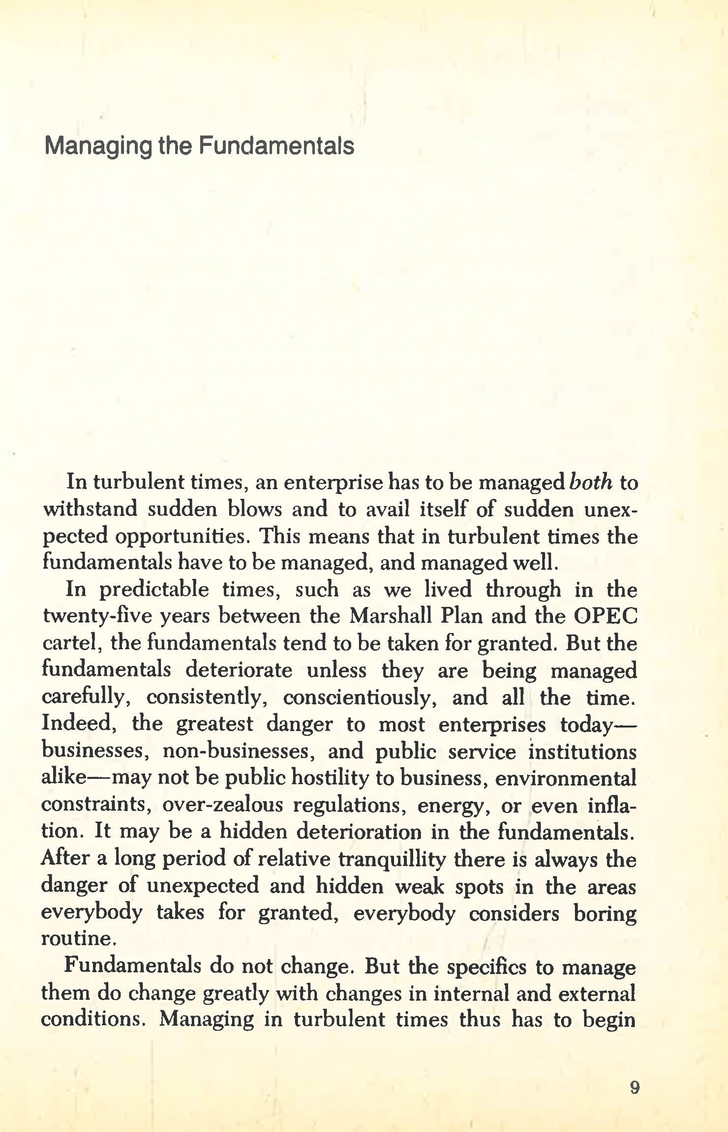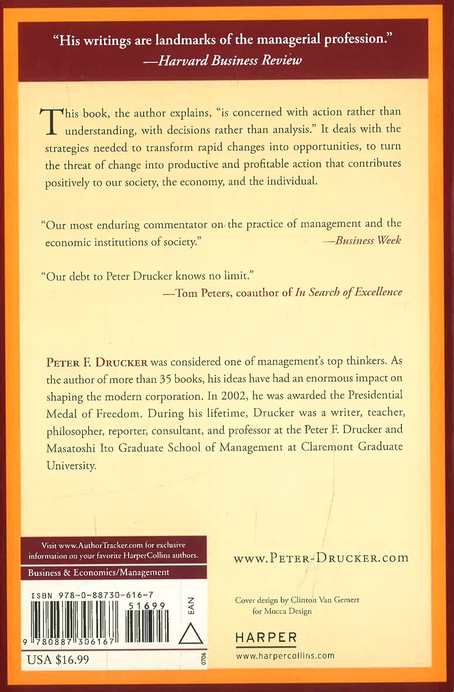 This book, the author explains, "is concerned with action rather than understanding, with decisions rather than analysis." It deals with the strategies needed to transform rapid changes into opportunities, to turn the threat of change into productive and profitable action that contributes positively to our society, the economy, and the individual.