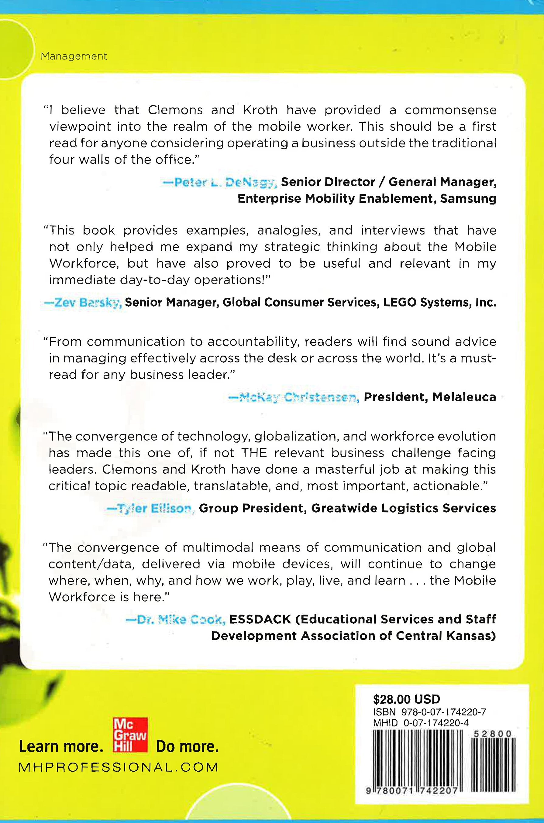 In the global marketplace, people can work practically anywhere and anytime. Managing the Mobile Workforce shares stories about organizations that have taken the risk to unleash--literally--their workers from the chains of daily commutes, 9-to-5 business hours, and the same old cubicles they have sat in day after day, year after year, and even decade after decade. David Clemons, an entrepreneur within the enterprise mobile and online training industry, and Michael Kroth, an expert and author on how leaders can create highly motivating work environments, together deliver rock-solid guidance on the essentials for building, leading, and sustaining a highly productive virtual workforce. Clemons and Kroth present the real-life relationships between managers and employees through interviews of thought leaders and executives that will engage your thinking about how the right leadership, combined with technology, can make all the difference. ,Tools, tips, and strategies for hiring, training, supporting, and motivating the modern mobile workforceIDC has estimated that mobile workers worldwide will surpass one billion by 2011. This isn't just a trend, but the direction that business is heading. Managing the Mobile Workforce gives managers and executives at all levels key essentials for coping with this new reality, empowering them to create, sustain, support, and reward a highly passionate and productive mobile work force. Managing the Mobile WorkforceShares startling facts and figures indicating how many workers already are and will be working Explains why trust is the glue that binds managers and workers together across vast distances-and how to achieve itProvides strategies to manage performance in a virtual world--and why mobility can actually increase productivityReveals how technology and great leadership can reduce the virtual distance between you and your mobile workersGives eight motivational principles and tools for mobile leadersSuggests a new way of looking at the virtual team development processStories from top execs at Samsung, Deloitte LLP, Hewlett-Packard, LEGO, and the Federal Office of Personnel Management, along with thought leaders like Joel Barker and Stephen M. R. Covey and other key industry experts will show you how the mobile workforce is changing the very landscape of business--and what you can do starting today to recreate their successes in your own organization.David Clemons has provided 20 years of executive leadership and innovation to the digital education industries. Today, as the CEO of Achieve Labs Inc., David is speaking nationally and internationally within the mobile industry. David lives in Eagle, Idaho, as a true mobile worker and employs a large "mobiForce," including international partners and content specialists. Michael Kroth, Ph.D., is an assistant professor at the University of Idaho in Adult/Organizational Learning and Leadership. He has authored Transforming Work: The Five Keys to Achieving Trust, Commitment, and Passion in the Workplace (2001), co-authored with Patricia Boverie; The Manager as Motivator (2006) and Career Development Basics (2009) with McKay Christensen. He is a memeber of the National Speaks Association and speaks nationally and internationally. Learn more about this book and David and Michael's work at www.managingthemobileworkforce.com.
