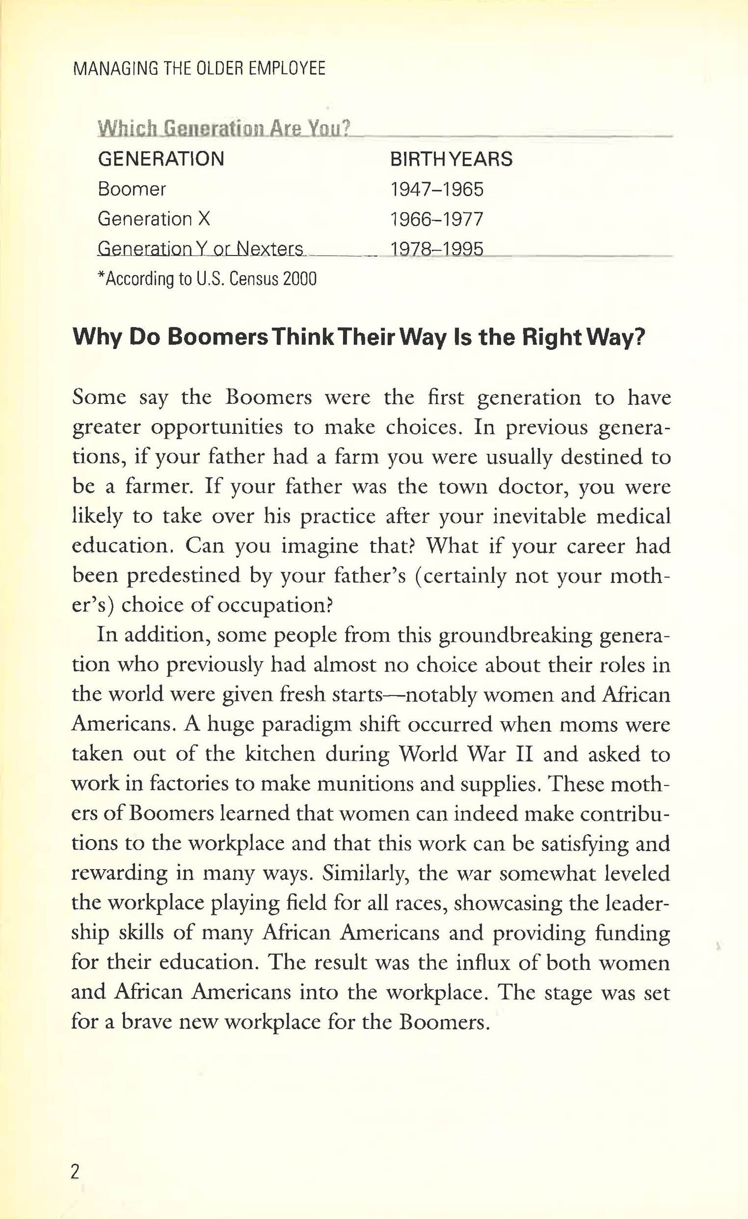 Gen Yers are coming into their own. Now making up the largest segment of the workforce at 80 million strong, many are new managers. With so many Baby Boomers holding off on retirement, these new Gen Y managers often must direct people their parents' age and older. Vast differences in communication styles, job expectations, and management techniques mean that Gen Yers have much to learn when it comes to managing those of their parent's generation, including: How to respond to an older employee who believes his seniority guarantees a promotion and raise, even though his work performance has been below average What to do when a younger manager relies on e-mail, texting, and IMing to communicate with coworkers, and his older employee prefers face-to-face communication How to demonstrate leadership and gain respect from the employees who already have years of rich business experience in the workplace This book is every manager's field guide for managing the new generationally diverse workforce.