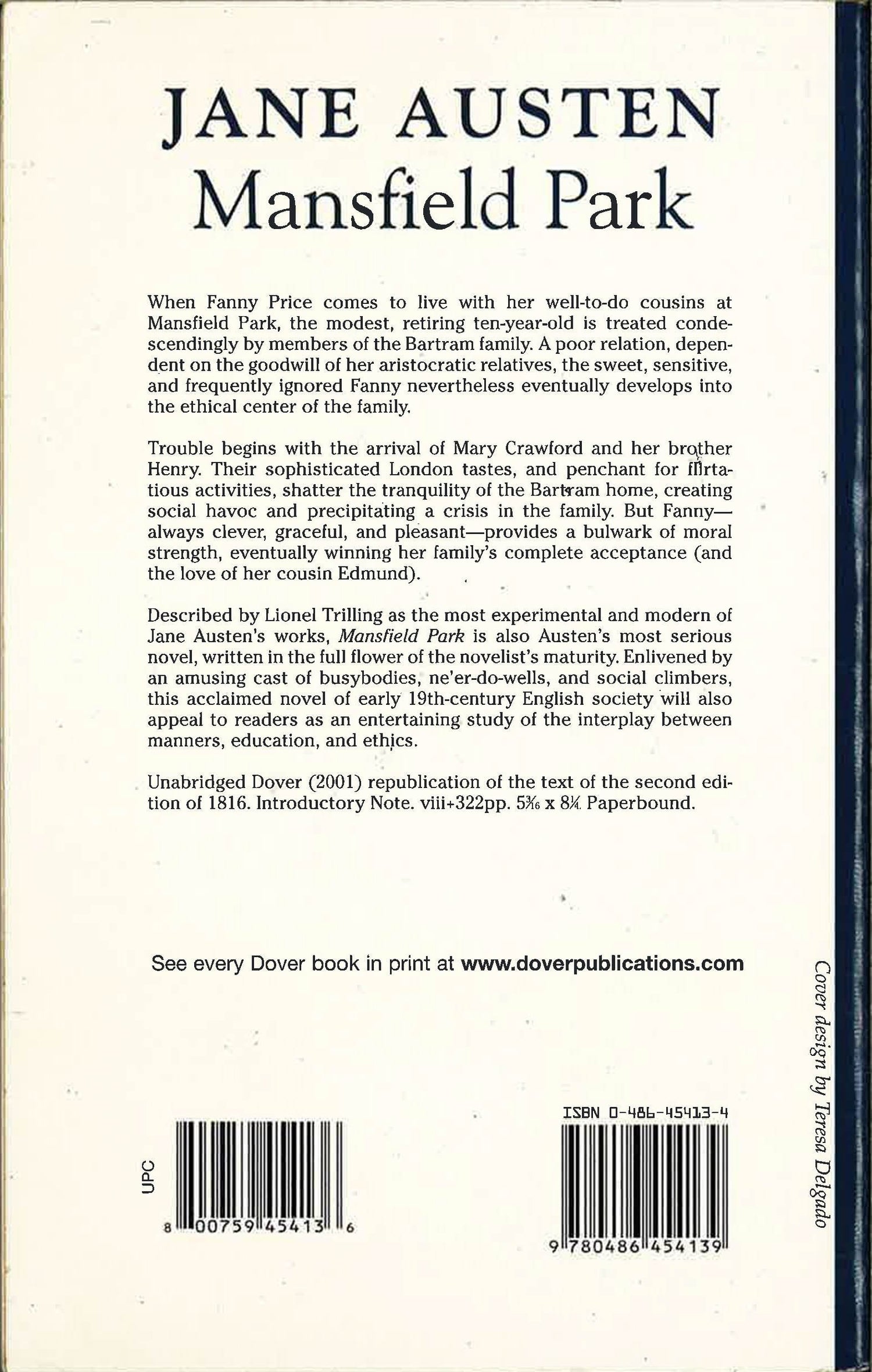 When Fanny Price comes to live with her well-to-do cousins at Mansfield Park, the modest, retiring ten-year-old is treated condescendingly by members of the Bartram family. A poor relation, dependent on the goodwill of her aristocratic relatives, the sweet, sensitive, and frequently ignored Fanny nevertheless eventually develops into the ethical center of the family. Trouble begins with the arrival of Mary Crawford and her brother Henry. Their sophisticated London tastes, and enchant for flirtatious activities, shatter the tranquility of the Bartram home, creating social havoc and precipitating a crisis in the family. But Fanny - always clever, graceful, and pleasant - provides a bulwark of moral strength, eventually winning her family's complete acceptance (and the love of her cousin Edmund).