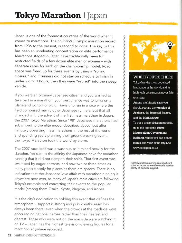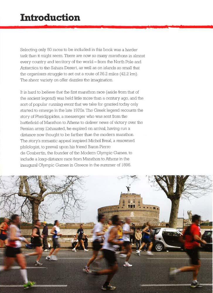 Marathon runners, prospective runners, and followers of marathon races will value this photo-illustrated guide to 50 of the world's best marathons. Each marathon is given its own detailed description, which includes-- A rating for comparative difficulty An expert analysis of the course The time year when it takes place Specifics on when and how to enter Course-specific training tips Just a small sampling of the marathons described include-- In the U.S. and Canada: Boston, New York, Washington, Toronto, Niagara Falls In Australia and New Zealand: Auckland, Sydney, the Australian Outback In Asia: Tokyo, Beijing, the Great Wall of China In Europe: Rome, Hamburg, Frankfurt, London, Amsterdam, Madrid, Athens, Venice . . .as well as races in the Caribbean islands, Africa, South America, and even the Antarctic. Approximately 160 vivid photos show many of the events in their colorful settings.