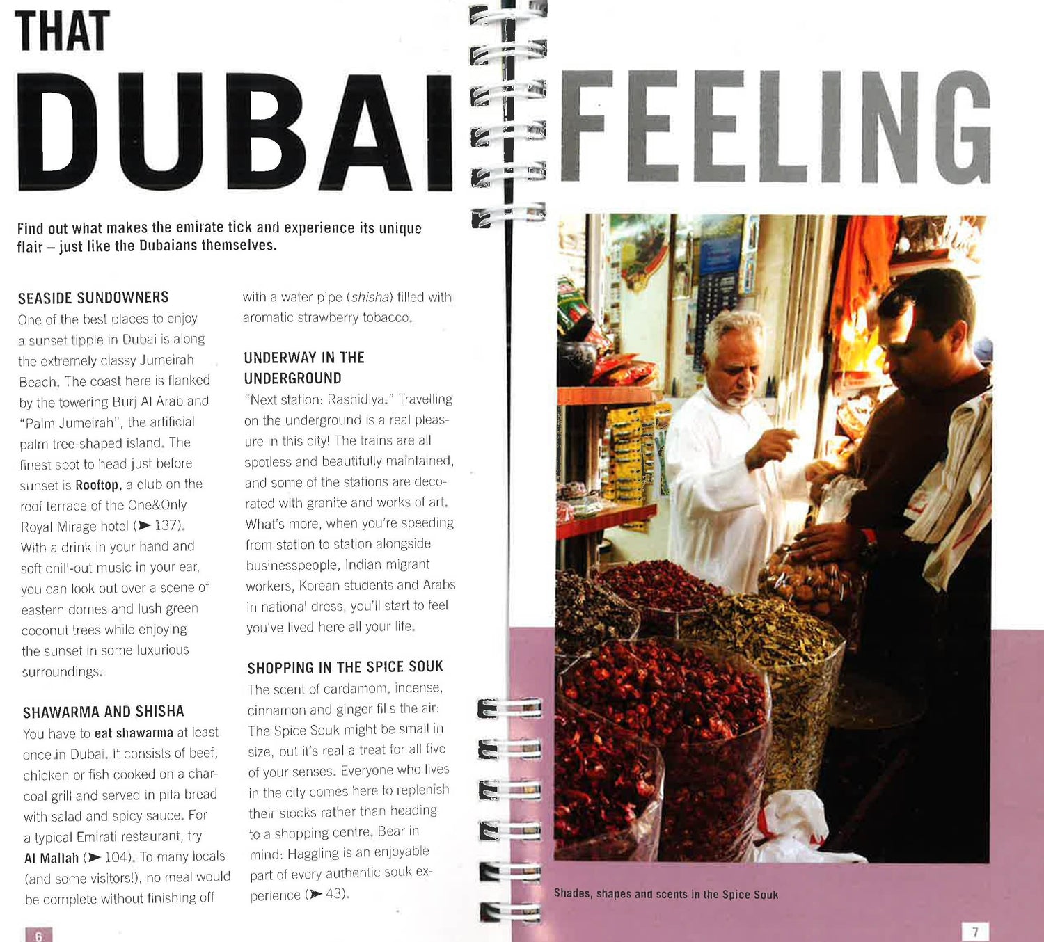 Perfect Days in... Dubai. For advice you can trust, look nofurther than Marco Polo. The Dubai Marco Polo Spiral Guide is a compact travel guide for people who have little time to prepare for a trip, don't want to miss anything, like to be inspired by great ideas for exciting days out and love all things ultra-practical and easy to use. Enjoy the sunset on Jumeirah Beach, tuck into a tasty shawarma or take in the scents of cardamom, incense, cinnamon and ginger at The Spice Souk. Dubai awaits! Inside the Dubai Marco Polo Spiral Guide: Top 10 sights: From the top down to make it easy to prioritize! That Dubai Feeling provides tips to help you experience the essence of the city and its locals. Get under Dubai's skin and see what makes it tick. Don't miss: Each chapter highlights the absolute must-sees for each area and what to do at your leisure if time permits. Chapters: Deira, Bur Dubai, East Jumeirah, West Jumeirah and New Dubai.Organised by area; each chapter explores the most important and interesting sights. Restaurant recommendations, the best shopping streets and the hottest places to go for a night out are listed at the end of each chapter. Perfectly planned itineraries for each area including the best places to eat and drink along the way, each with its own map, make exploring easy and stress-free for Perfect Days in Dubai! Coverage of Dubai Creek, The Souks, Dubai Museum, Bastakiya, Sheikh Saeed AlMaktoum House, BurJuman Centre, Creekside Park, Burj Khalifa, Jumeirah Mosque, The Dubai Mall, Dubai WorldTrade Centre, Jumeirah Emirates Towers, Burj Al Arab, Dubai Marina, Atlantis,The Palm, Madinat Jumeirah and more. Street Atlas & pull out map: The best of both worlds! Some people prefer an atlas while others prefer a separate map - Marco Polo Spiral Guides have both!The separate, fully indexed pull-out map is handily placed in a high-quality plastic wallet at the back of the guide, which can also be used as a storage pocket. Top 10 reasons to come back: For those undecided about a return visit...there is a list of Top 10 reasons to come back again!