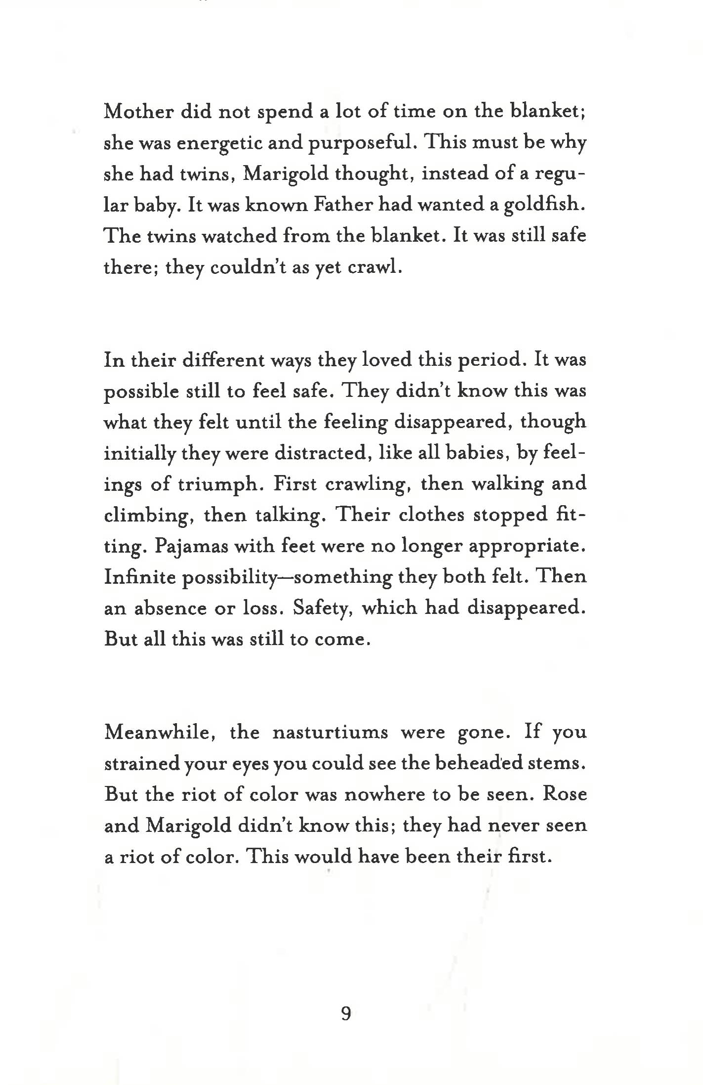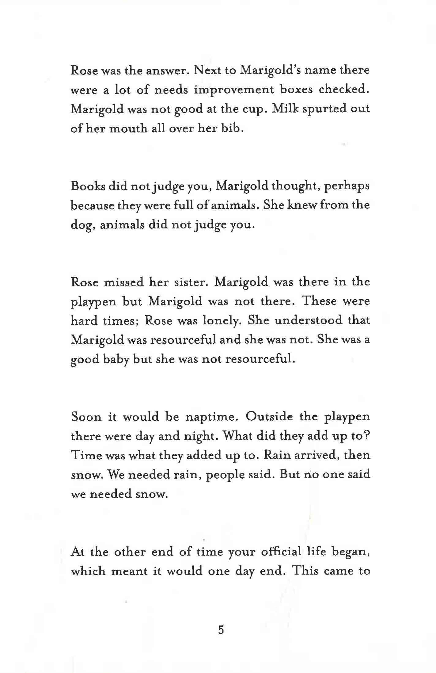 Here are the elements you’d expect to find in a story of infant twins: Father and Mother, Grandmother and Other Grandmother, bath time and naptime—but more than that, Marigold and Rose is an investigation of the great mystery of language and of time itself, of what is and what has been and what will be. “Outside the playpen there were day and night. What did they add up to? Time was what they added up to. Rain arrived, then snow.” The twins learn to climb stairs, they regard each other like criminals through the bars of their cribs, they begin to speak. “It was evening. Rose was smiling placidly in the bathtub playing with the squirting elephant, which, according to Mother, represented patience, strength, loyalty and wisdom. How does she do it, Marigold thought, knowing what we know.”