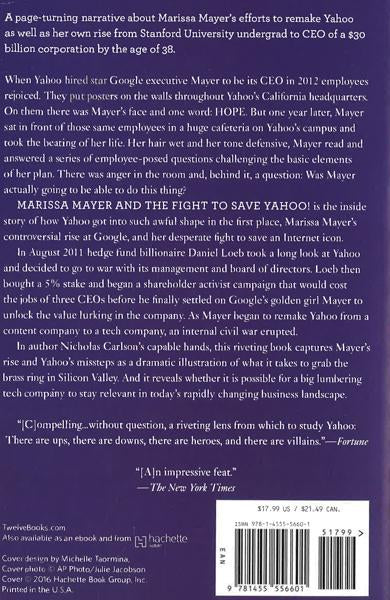 The New York Times says the book is "a lot of fun to read" and "an impressive feat." The New York Times also writes, "As Nicholas Carlson demonstrates in MARISSA MAYER AND THE FIGHT TO SAVE YAHOO!, a vivid account of her vertiginous career climb, Mayer is worth paying attention to for reasons that transcend gender. Carlson presents her as a complex personality who defies most stereotypes." "A corporate thriller [that does] a superb job of bringing to life the dramatic story of Yahoo." --The Financial Times "A quick, compelling read...[one that] is, without question, a riveting lens from which to study Yahoo: There are ups, there are downs, there are heroes, and there are villains." --Fortune