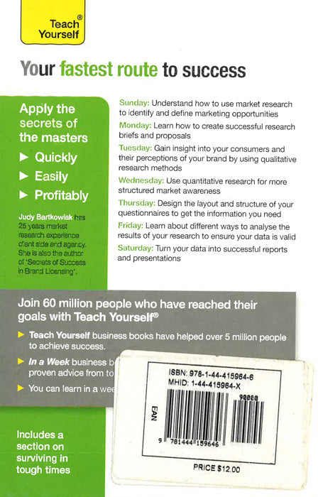 The ability to research the market for a product or service is crucial for anyone who wants to advance their career. Written by Judy Bartkowiak, a leading expert on market research as both a coach and a practitioner, this book quickly teaches you the insider secrets you need to know to in order understand your consumers. The highly motivational 'in a week' structure of the book provides seven straightforward chapters explaining the key points, and at the end there are optional questions to ensure you have taken it all in. There are also cartoons and diagrams throughout, to help make this book a more enjoyable and effective learning experience. So what are you waiting for? Let this book put you on the fast track to success!