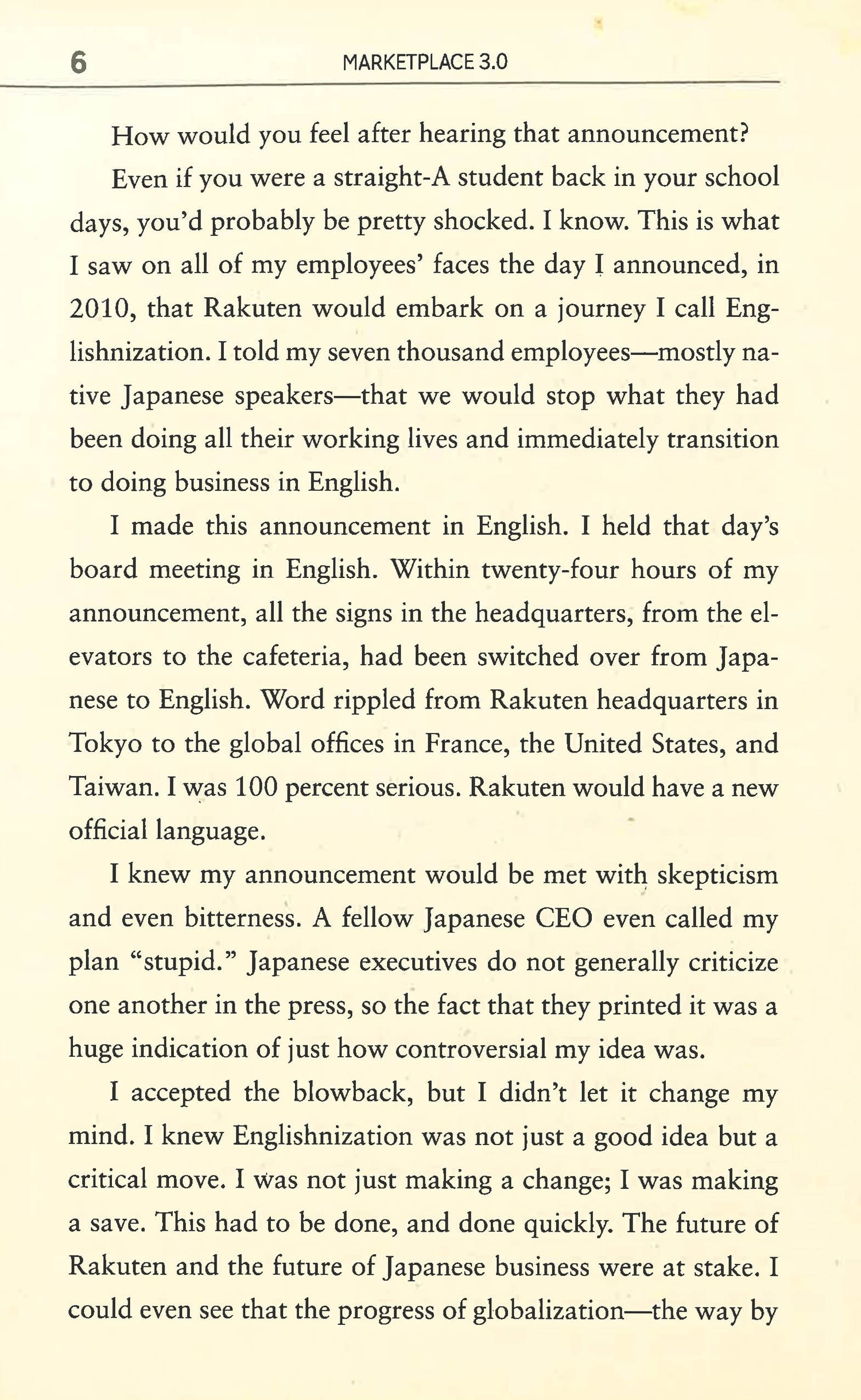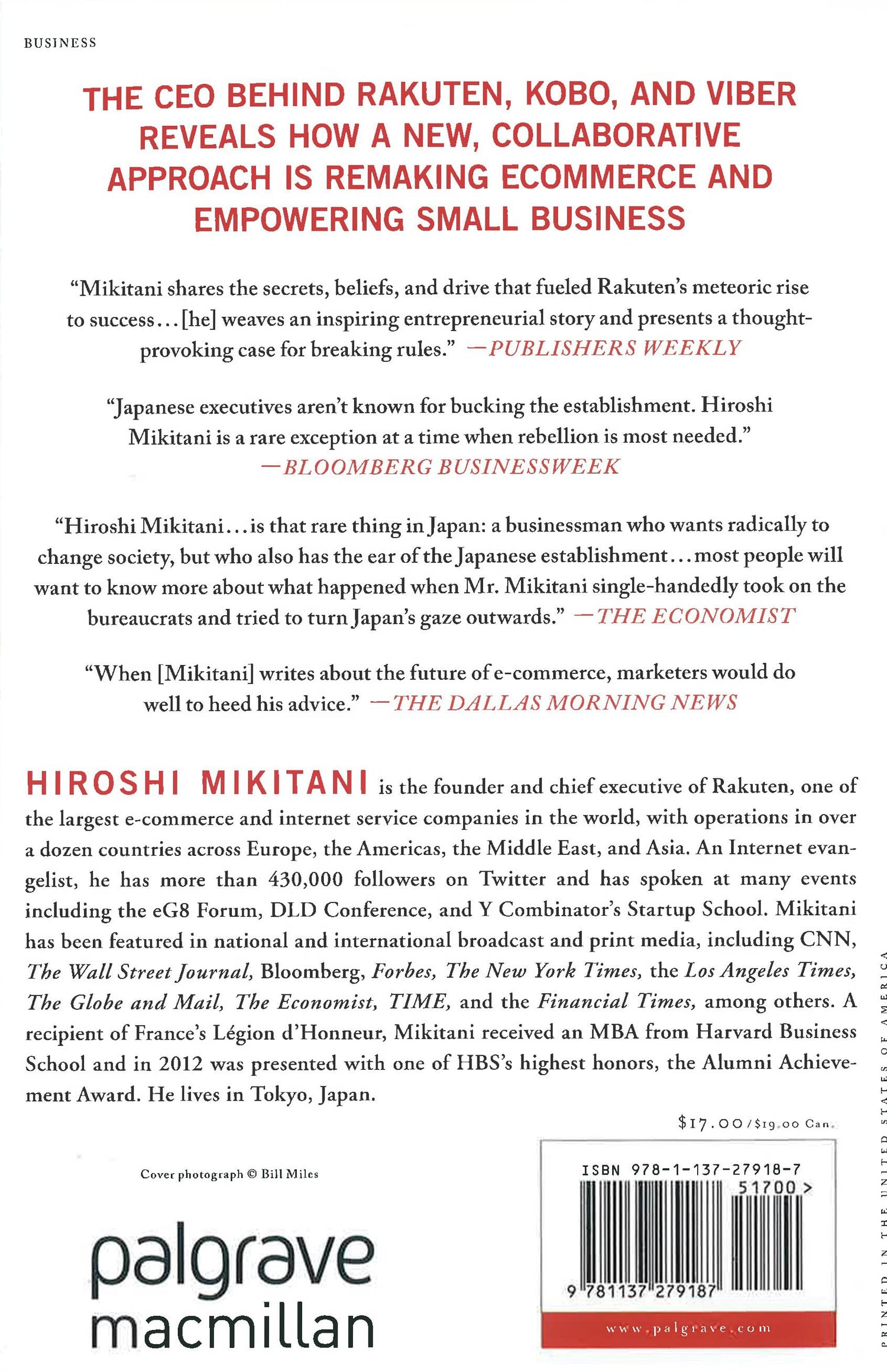 Hiroshi Mikitani, founder of e-commerce giant Rakuten, has seen the next battleground in the fight for the future of the Internet. Today's major e-commerce players are quietly building borderless platforms that are overturning the global brick-and-mortar model, and changing the way local businesses think about their customers. But is this good or bad? Rejecting the zero-sum model practiced by some global retailers, who view the Internet purely as a facilitator of speed and profit, Mikitani argues for an alternate model that benefits vendors, customers, and communities alike by empowering players at every step in the process. He envisions retail "ecosystems", where brick-and-mortar businesses around the world partner with e-retailers to maximize their customer bases and service capabilities, and he shows why emphasizing collaboration over competition, customization over top-down control, and long-term growth over short-term revenue is by far the best use of the Internet's power. Rakuten is already pioneering this new model, and Marketplace 3.0 offers colorful examples of its success in Japan and around the world. Mikitani reveals how the company enforces a global mindset (for instance, by requiring all its employees to speak English, even in Tokyo); how it incorporates new acquisitions rather than seeking to sell them for a quick profit; and how it competes with other retailers on speed and quality, without sacrificing the public good.