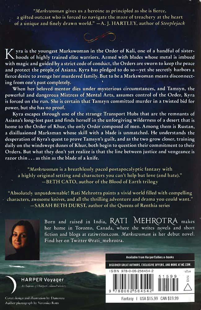 Kyra is the youngest Markswoman in the Order of Kali, her world defined by a strict code of conduct. The Orders are the gifted elite, armed with telepathic blades and sworn to protect the people of Asiana. But to be an Markswoman means to let go of your past completely, and Kyra struggles with her desire to avenge her dead family, a desire that threatens to consume her.